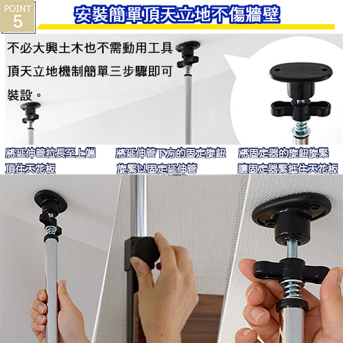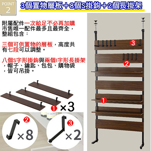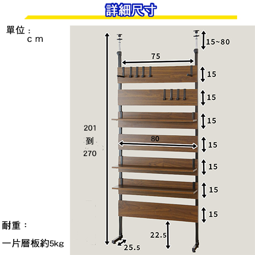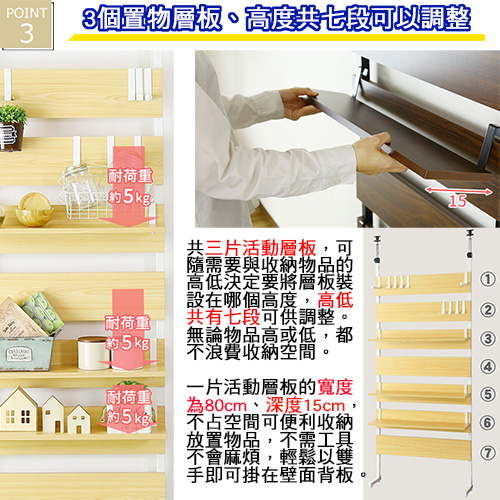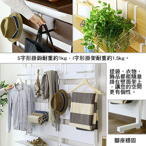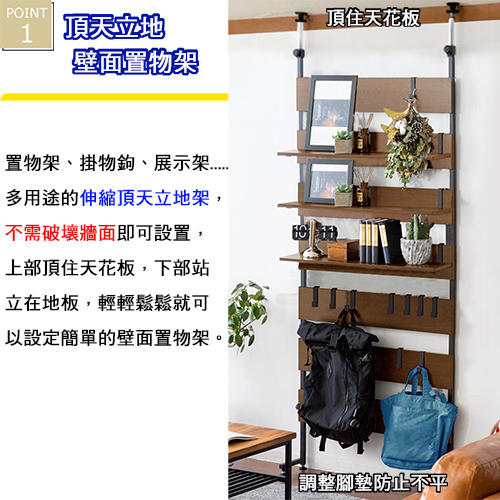 ★新時代新生活的壁面收納STYLE~自在的收納與展示!★不傷害現有的壁面,不必鑽孔不用釘牆壁,就像牆壁內建的壁面收納架,頂天立地的設計,層板可自在的調整高度,加上不同功能的掛架,設計新穎實用,簡單安裝就能擁有屬於您的收納與展示空間。《C&B》頂天立地工業棧板風格壁面置物架,是日本最新流行的復古『鐵』+『木』的組合商品,粉體塗裝的鐵管與具木材紋路的木板,整體營造出工業復古風格,高質感有格調,100%台灣生產,採用符合日本市場要求的板材防刮耐潑水易清理,無論是層板的用料或鐵管的厚度與規格皆是外銷商品的要求,質感佳耐用性強。工業風棧板造型的壁面省空間是本商品的設計重點,配件數量與市售類似品相比最多最齊全,一次給足不必再加購。八個S字形掛鉤與兩個I字形長掛架適用於掛衣、掛袋或掛物。從上到下共有七片棧板造型的背板可供安裝活動層板,您可自行決定將三片層板安裝在任一個您想安裝的高度,完全符合您自身的使用需求,客製化般的貼心猶如量身訂做。頂天立地的設計,從天花板到地板穩穩支撐著,不須大興土木也不用於牆壁鑽孔,三個步驟即可簡單設置。收納力:1. 可移動置物層板x32. S字形掛鉤x83. I字形長掛架x2機能性:1. 層板可調整使用位置共7段可調整2. 底部調整腳墊,可微調高度防止地面不平3. 頂天立地安裝簡單,不用破壞牆面設計性:1. 工業風格兩種異素材的搭配,造型優雅2. 流行的外表,放置於室內使用提升質感■商品規格尺寸 : 約(W)80 x (D)25.5 x (H)201~270cm主要材質 : 鐵管(粉體塗裝)、PB板產地 : 台灣■注意事項1.本商品附詳細組裝說明書,需DIY自行組裝。2.DIY商品經組裝後恕不接受退貨,請先確認商品是否符合要求。3.商品圖檔顏色因電腦螢幕設定差異會略有不同,請以收到的實際商品顏色為準。4.若需退貨,請保持商品及包裝之完整性,無法回復原出貨之完整包裝恕不接受退換貨。5.送達地點有否限制:限本島,外島須外加運費。我們將事先與消費者聯繫報價,議定外島運費後,訂單始成立。6.本島偏遠地區接單說明:物流業者定義之本島偏遠地區接單須另加聯運費。我們將事先與消費者聯繫報價,議定聯運費後,訂單始成立。7.鑑賞期限制說明:溫馨提醒,鑑賞期非試用期, 敬請確認商品無瑕庛問題並確認購買後再使用。8.收到貨品時,要將外箱保留至鑑賞期結束,不要讓貨運公司將外箱帶走,換貨時換貨商品必須是全新狀態(不得有刮傷),並有完整的包裝,包含外紙箱、配件紙箱、保麗龍、保護袋、贈品等所有附隨文件或資料之完整性。9.偏遠地區概略表:以下地區為物流公司定義之偏遠地區,若有增刪皆以物流公司的認定為準。(1).新竹:尖石鄉、五峰鄉 (2).苗栗:泰安鄉 (3).台中:梨山、谷關、環山、和平鄉 (4).南投:鹿谷鄉、仁愛鄉 (5).雲林:古坑鄉 (6).嘉義:阿里山鄉、梅山鄉、嘉義農場 (7).高雄:內門鄉、杉林鄉、甲仙鄉、六龜鄉、甲仙鄉(小林村)、六龜鄉(寶來村) (8).屏東:霧台鄉、春日鄉、泰武鄉、三地門鄉 (9).宜蘭:大同鄉、南澳鄉 (10).花蓮:秀林鄉、池上鄉、海端鄉 (11).台東:長濱鄉、東河鄉(北源村)、台東地區(牧場&監獄)
