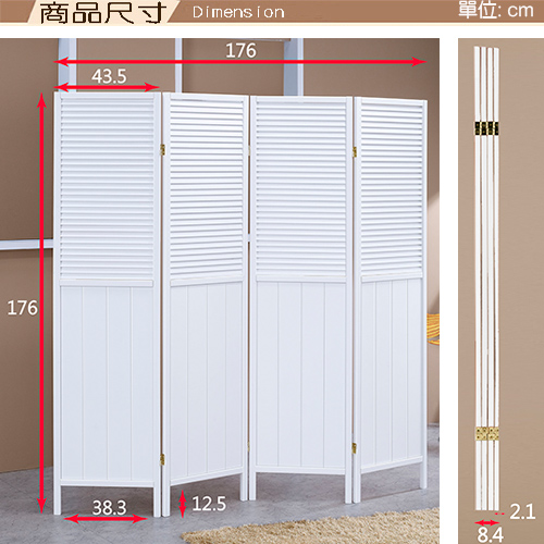 想要將家裡的空間再做規劃與變更卻又不想大動拆建的工程嗎?屏風是佈置生活空間最靈活的選擇!《C&B》雪之藏百葉四面屏風,高度足足有176cm,實木搭配木板製作,造型時尚大方,台灣生產外銷日本,是高質感的台灣精品。不同於一般市面上的不織布面木格屏風,百葉屏風沒有正反面、兩面都是正面,更適合當做隔屏。上下相異的時尚設計不單調不呆板,上方高成本的百葉設計可透風也可透光減輕壓迫感,下方高質感的木板拉溝更添加了外觀的厚重與溫潤,是質感極佳的百葉屏風。可任意折合的特殊五金,想怎麼折都可以,各種角度皆可調整,能夠讓四面屏風依您的需要做成任何造型來擺放,屏風也變成是一種裝飾,輕易提升居家氛圍。不使用的時候,也可以輕鬆折合快速收納,牆角、床底、沙發底下都能收納不占空間。適合各種空間使用的屏風,您只要展開即可輕鬆區隔出不同的使用空間,更可以當成裝潢與裝飾的一部份,隱藏家中凌亂的地方,屏風也具有隔屏或改變風水的效果,簡簡單單即可創造家中的活動牆,無論是在家中或辦公室甚至餐廳等營業場所,美觀實用!特別是用在家庭造景方面也很適合,值得您的選購!屏風小教室 :放置時若採M字形擺放,十分穩固不怕傾倒若想要採一字形擺放,必須加購腳座才能站穩,請聯繫店家加購『C&B系列屏風的專用屏風腳座/底座』■商品規格: 尺寸 : 展開時 : 約寬176 x 深2.1 x 高176cm 折疊時 : 約寬43.5 x 深8.4 x 高176cm 材質 : 天然松木 , MDF板 產地 : 台灣 ■注意事項 1.不需DIY,打開紙箱後取出商品即可使用。 2.商品圖檔顏色因電腦螢幕設定差異會略有不同,請以收到的實際商品顏色為準。 3.本商品僅配送至送貨地址一樓,無協助配送上樓,若司機願意配送上樓可能會有樓層費。 4.若需退貨,請保持商品及包裝之完整性,無法回復原出貨之完整包裝恕不接受退換貨。 5.送達地點有否限制:限本島,外島須外加運費。我們將事先與消費者聯繫報價,議定外島運費後,訂單始成立。 6.本島偏遠地區接單說明:物流業者定義之本島偏遠地區接單須另加聯運費。我們將事先與消費者聯繫報價,議定聯運費後,訂單始成立。 7.鑑賞期限制說明:溫馨提醒,鑑賞期非試用期, 敬請確認商品無瑕庛問題並確認購買後再使用。 8.收到貨品時,要將外箱保留至鑑賞期結束,不要讓貨運公司將外箱帶走,換貨時換貨商品必須是全新狀態(不得有刮傷),並有完整的包裝,包含外紙箱、配件紙箱、保麗龍、保護袋、贈品等所有附隨文件或資料之完整性。 9.偏遠地區概略表:以下地區為物流公司定義之偏遠地區。 (1).新竹:尖石鄉、五峰鄉 (2).苗栗:泰安鄉 (3).台中:梨山、谷關、環山、和平鄉 (4).南投:鹿谷鄉、仁愛鄉 (5).雲林:古坑鄉 (6).嘉義:阿里山鄉、梅山鄉、嘉義農場 (7).高雄:內門鄉、杉林鄉、甲仙鄉、六龜鄉、甲仙鄉(小林村)、六龜鄉(寶來村) (8).屏東:霧台鄉、春日鄉、泰武鄉、三地門鄉 (9).宜蘭:大同鄉、南澳鄉 (10).花蓮:秀林鄉、池上鄉、海端鄉 (11).台東:長濱鄉、東河鄉(北源村)、台東地區(牧場&監獄)