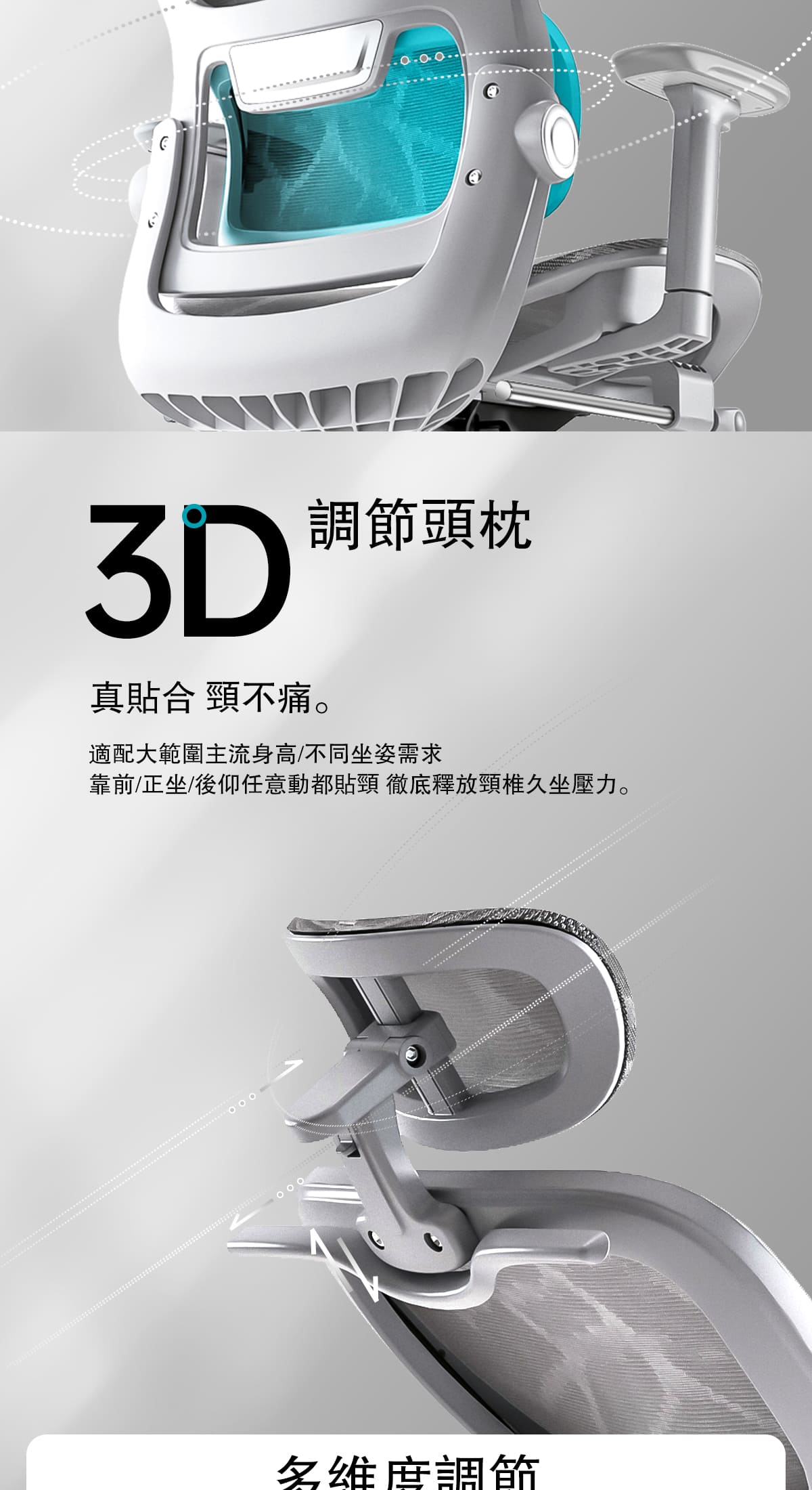 -3向調節頭枕+3向調節扶手適應多種使用