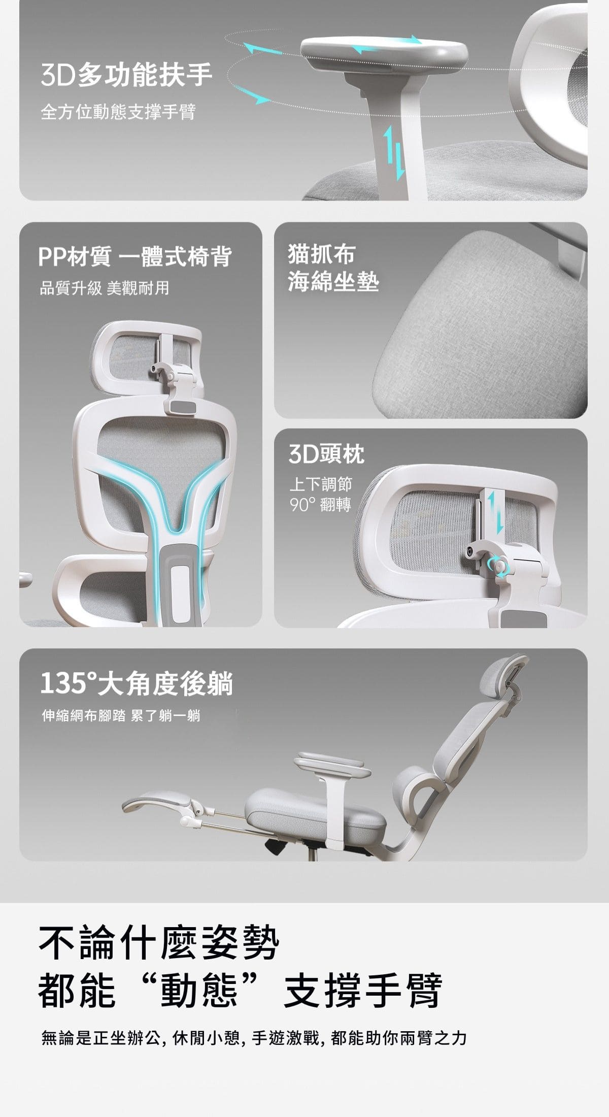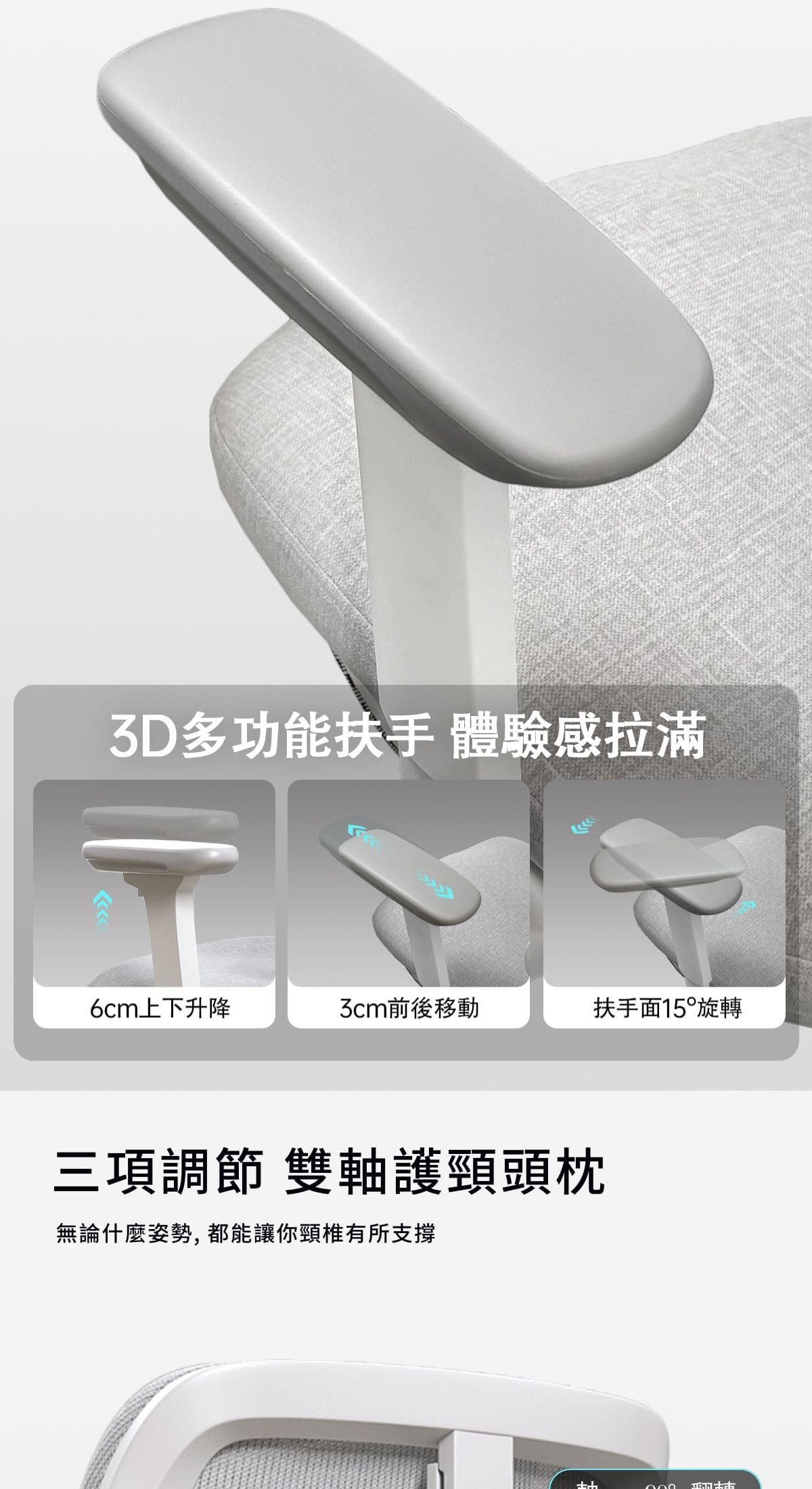 -3D調節頭枕+3D多功能扶手,適應多種使用