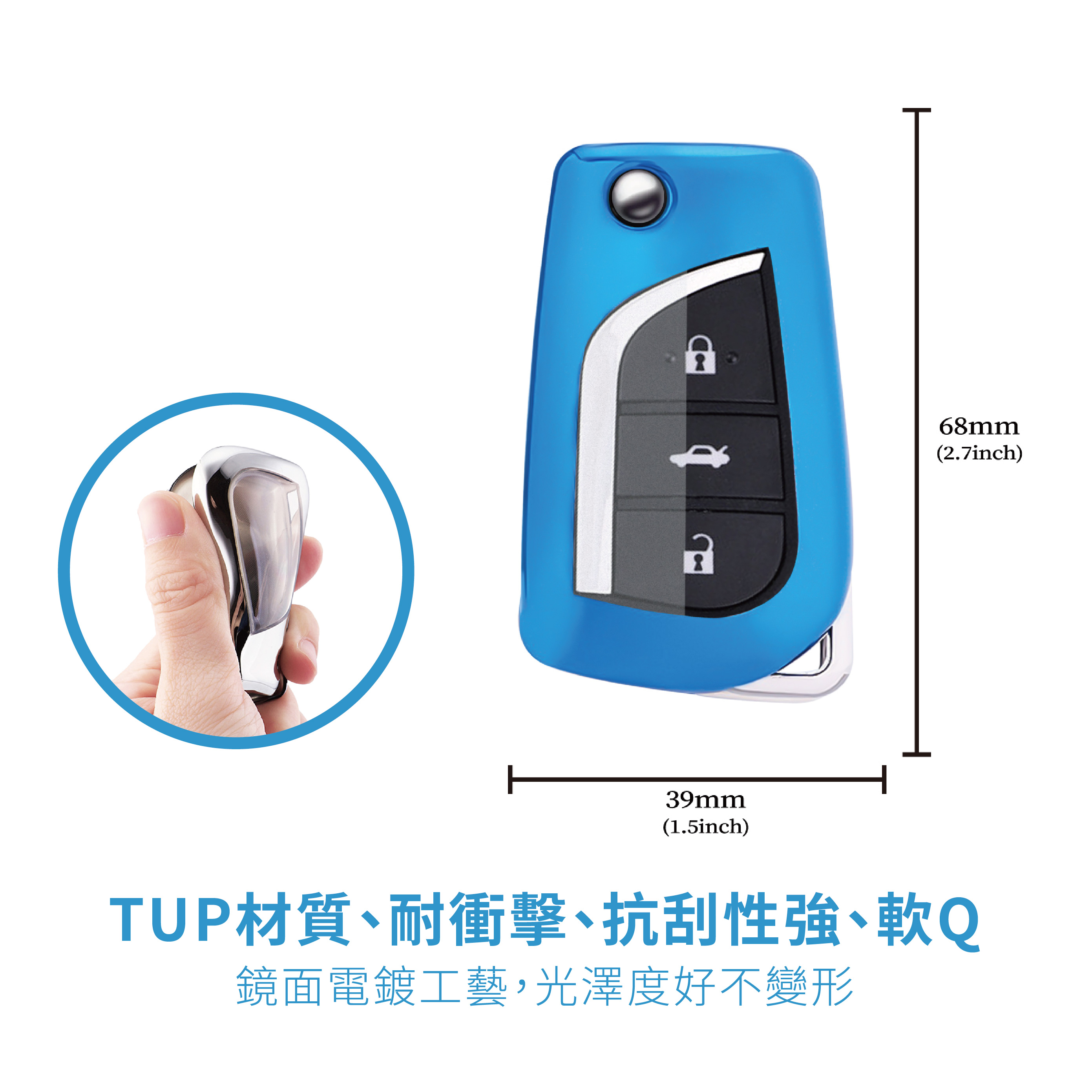 【產品優勢】★年輕簡約配色。★納米TPU材質可反複使用便於清洗★柔韌有彈性的透明膜可防止指甲劃傷按鍵★手感舒適柔軟,回彈性強★不影響信號 ,按鍵靈敏不影響按鍵感應,信號依舊★鏡面電鍍工藝,耐刮防摔★360° 全面保護,防爆 抗摔 高檔時尚 無信號影響 全包防水防刮 保護愛車鑰匙★雙層保護,集美觀實用於壹身★分體式安裝設計,TPU材質環保時尚★量身定制的原始汽車鑰匙★散熱材料 – 吸汗, 防止異味
