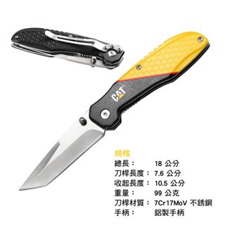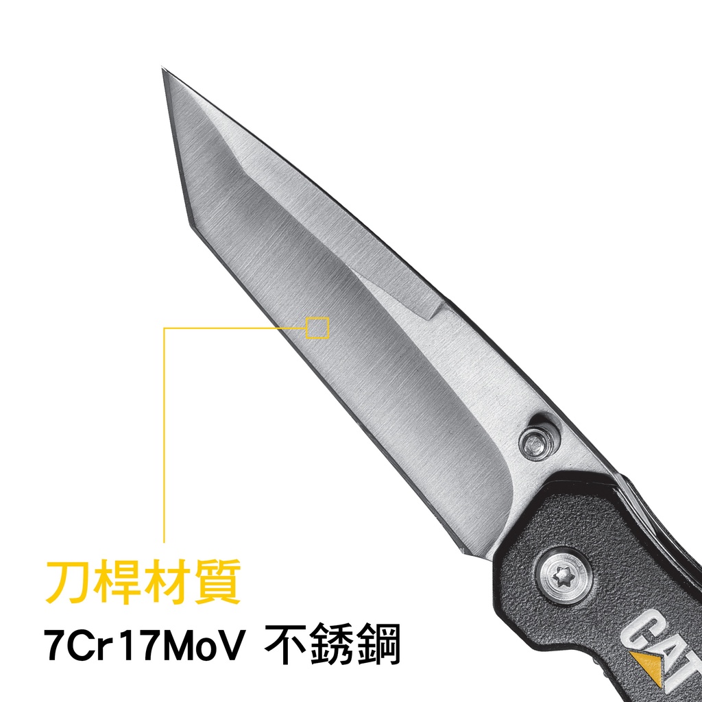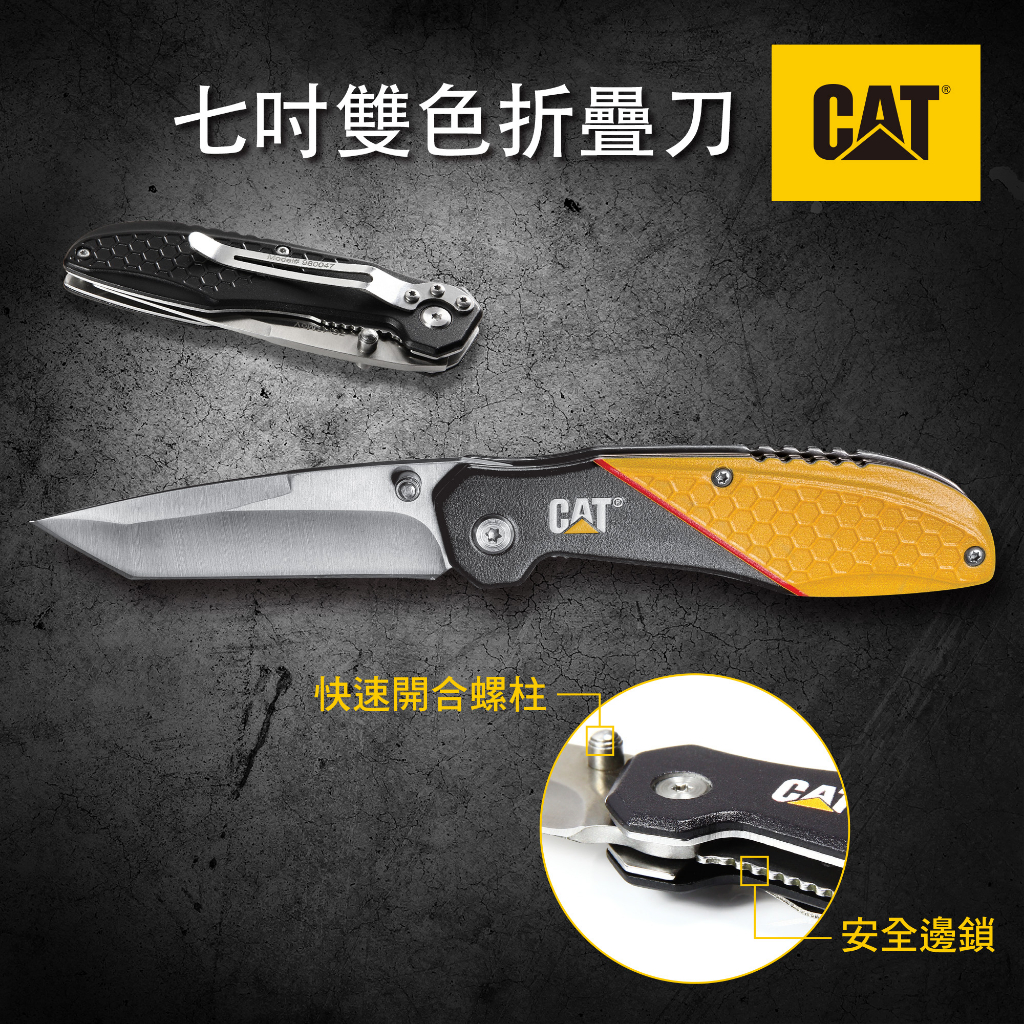 CAT七吋經典多用途折疊刀外觀採用雙色3D列印設計,完美刻畫CAT工具印象於折疊刀上,不僅擁有了與眾不同的時尚外觀,並具有防潮、防鏽和耐用特性。 折疊刀為鋁合金材質手柄結合了耐用、輕便和時尚於一體,刀刃採用7Cr17mov合金鋼具有高硬度和超強韌性,材質兼具高硬度與超強韌性,使折疊刀極為鋒利而又耐用,可做為安全防身工具、登山露營折疊刀與戰術刀 。CAT 七吋經典多用途折疊刀具有刀片安全鎖定裝置,此為CAT工具獨家專利設計,在使用時,刀刃固定不摺疊收回,大大的提高使用時的安全與便利性。另外刀桿上的螺柱提供使用者單手快速展開折疊刀。CAT 七吋經典多用途折疊刀展開總長為18公分,8公分的刀桿和10公分手柄為折疊刀的完美比列,透過CAT工具輕量化設計,使重量只有5盎司,方便攜帶。