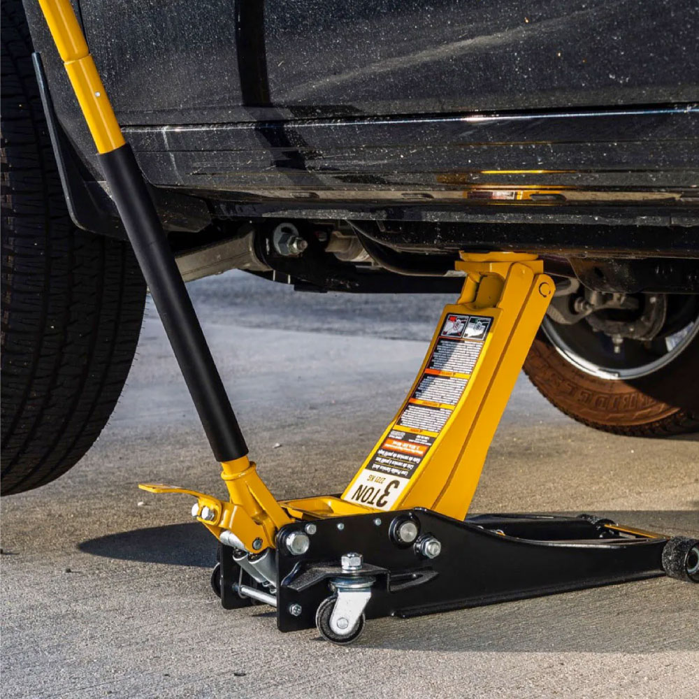 Cat® 3噸低位千斤頂提供 7.6至 49公分的舉升範圍,低揚程與重型設計適用於各式低底盤跑車、各式轎車、與重型休旅車和皮卡車。雙氣壓幫浦設計,只需 7下即可升到最高高度,內建腳踏板,方便省力、精確定位千斤頂於車下。滾珠軸承萬向腳輪、貼心手柄護墊與小零件托盤,是你修車最佳的選擇。