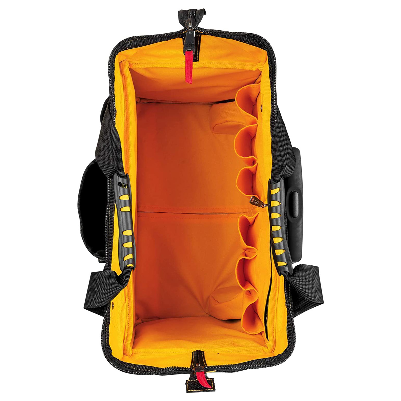 CAT工具18 英吋工具箱具有伸縮式拉桿和超大輪子,方便於在各種工作場所移動操作。工具拉桿箱包括 18 個工具置物空間與主儲物箱。拉桿工具袋採用最高等級1680D牛津布材質製成,並採用加強型縫合技術於每個工具袋接縫處,使拉桿箱具有超高耐用和防潑水特性。拉桿箱底部和側邊均由增強注塑成形,硬殼結構可防止拉桿箱潮濕、撕裂和磨損。主儲物箱採CAT工具高辨識度黃底設計,可輕易收納各式電動工具、電源線、電線、充電器、儀表等。 6 個內部口袋和 12 個外部口袋為您最常用的工具、儀表和裝備提供了方便的存儲空間。