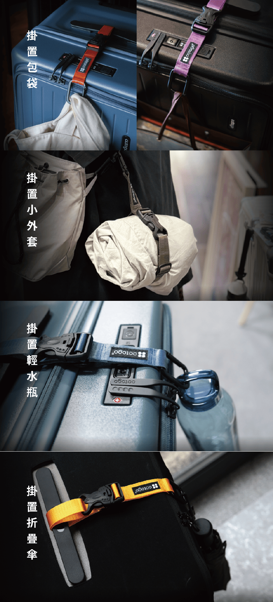 行李太多?這一扣,全部搞定。cctogo行李掛鉤釦,選用安全扣設計,穩固耐用不脫落,適用各式行李箱、手提袋、後背包、甚至嬰兒車與推車。✔︎ 安全扣件設計,穩固不脫落✔︎適用行李箱、各類包袋、嬰兒車、推車...等✔︎可調節長度,隨意吊掛✔︎9色可選,輕鬆搭配你的旅行風格每一扣,都是貼心的旅行小幫手。