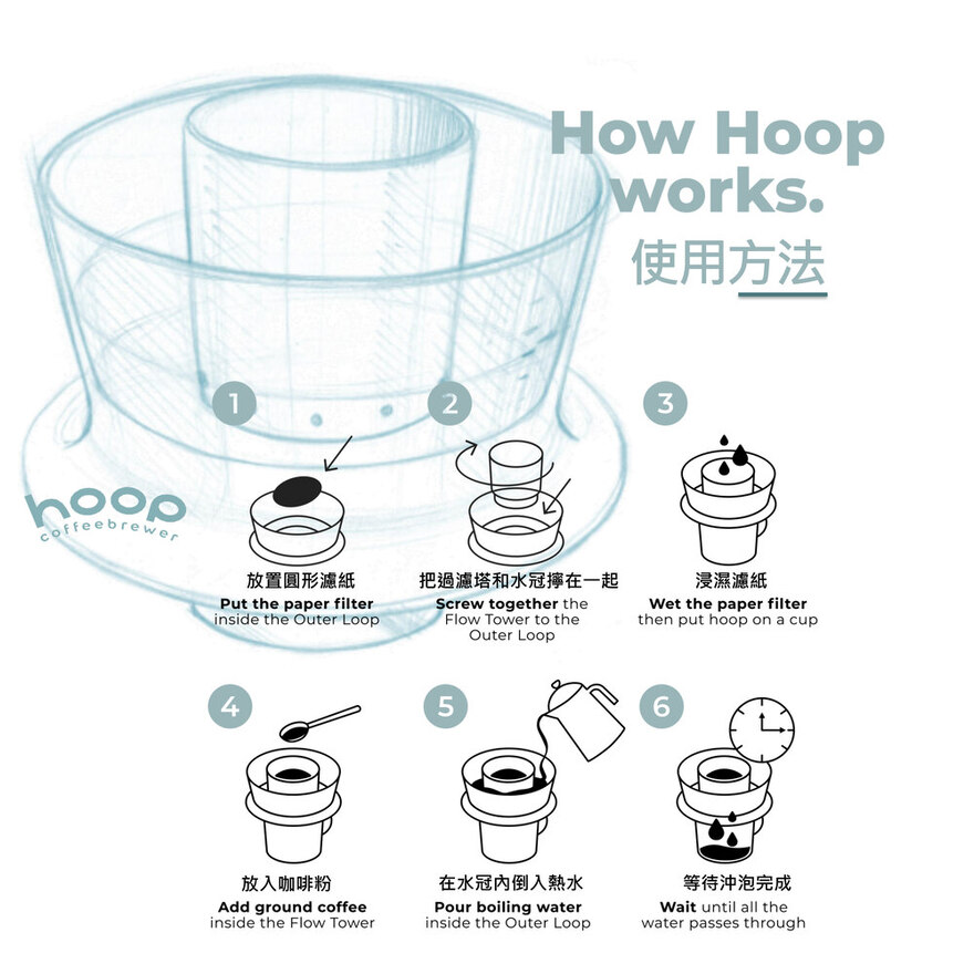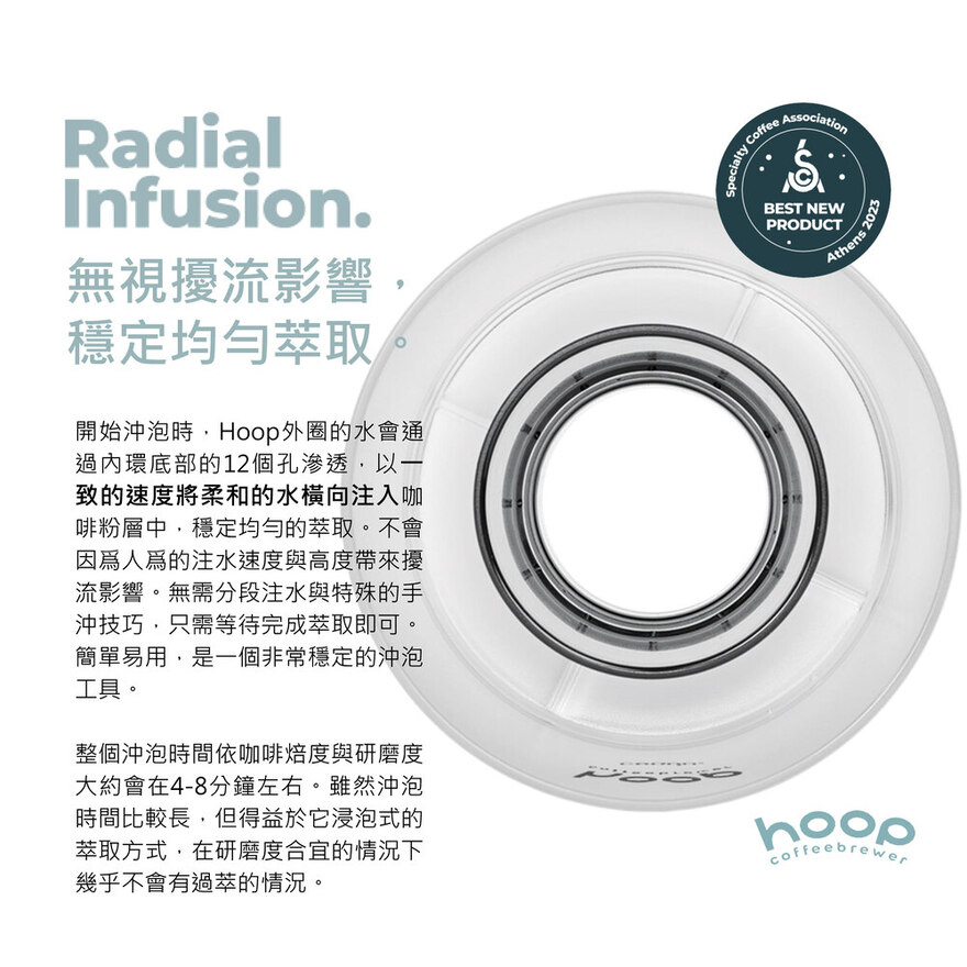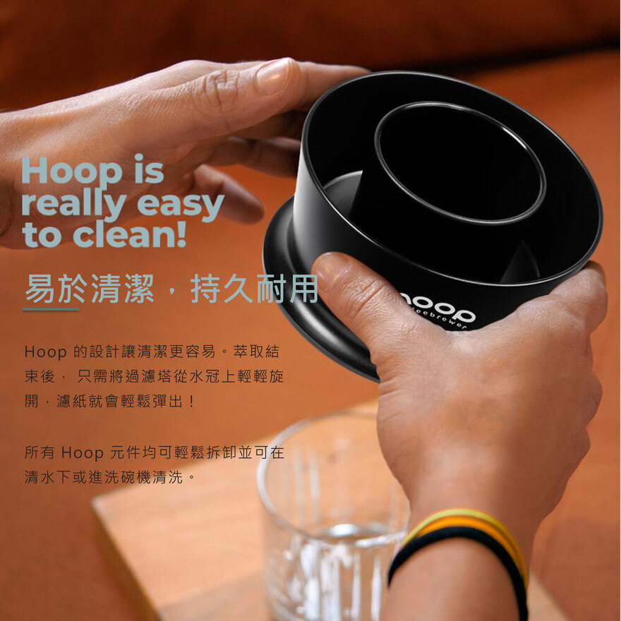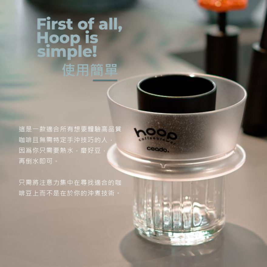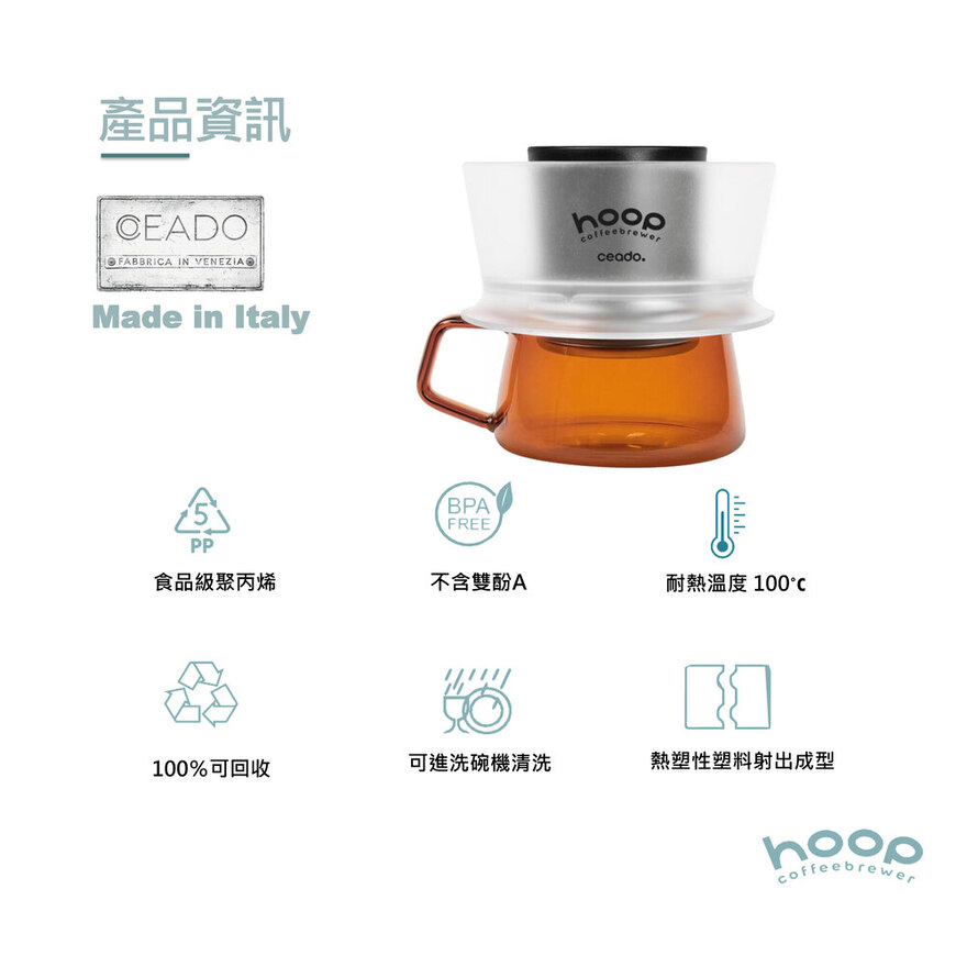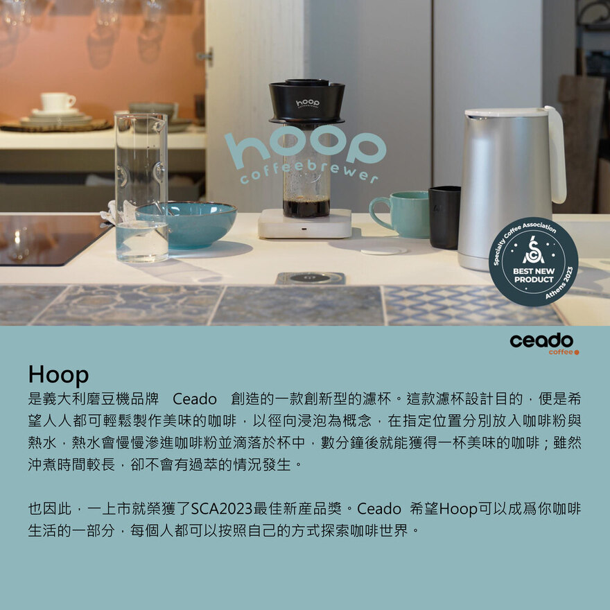 Hoop是義大利磨豆機品牌 Ceado 創造的一款創新型的濾杯。這款濾杯設計目的,便是希望人人都可輕鬆製作美味的咖啡,以徑向浸泡為概念,在指定位置分別放入咖啡粉與熱水,熱水會慢慢滲進咖啡粉並滴落於杯中,數分鐘後就能獲得一杯美味的咖啡 ; 雖然沖煮時間較長,卻不會有過萃的情況發生。也因此,一上市就榮獲了SCA2023最佳新産品獎。Ceado 希望Hoop可以成爲你咖啡生活的一部分,每個人都可以按照自己的方式探索咖啡世界。【商品特色】✔️ 易於清潔Hoop 的設計讓清潔更容易。萃取結束後, 只需將過濾塔從水冠上輕輕旋開,濾紙就會輕鬆彈出!所有 Hoop 元件均可輕鬆拆卸並可在清水下或進洗碗機清洗。✔️ 持久耐用選用食品級聚丙烯,熱塑性塑料射出成型BPA-Free 不含雙酚A : 保護健康與環境耐熱溫度 100˚C產品與包材100%可回收可進洗碗機清洗✔️ 使用簡單這是一款適合所有想要體驗高品質咖啡且無需特定手沖技巧的人,因爲你只需要熱水,磨好豆,再倒水即可。只需將注意力集中在尋找適合的咖啡豆上而不是在於你的沖煮技術。✔️ 均勻萃取開始沖泡時,Hoop外圈的水會通過內環底部的12個孔滲透,以一致的速度將柔和的水橫向注入咖啡粉層中,穩定均勻的萃取。不會因爲人爲的注水速度與高度帶來擾流影響。無需分段注水與特殊的手沖技巧,只需等待完成萃取即可。簡單易用,是一個非常穩定的沖泡工具。整個沖泡時間依咖啡焙度與研磨度大約會在4-8分鐘左右。雖然沖泡時間比較長,但得益於它浸泡式的萃取方式,在研磨度合宜的情況下幾乎不會有過萃的情況。【商品規格資訊】淨 重 : 165g毛 重 : 260g材 質 : 食品級聚丙烯耐熱溫度 : 100˚C産 地 : 義大利尺 寸 : 13.2 x 8.4 cm顔 色 : 黑色、透明、海藍色産 品內容 : 濾杯、100張配套圓形濾紙適 配濾紙 : 適配58mm-62mm圓形濾紙容 量 : 濾紙最大承重 20g 咖啡粉杯 口 : 可配直徑 7-10 cm可進洗碗機清洗台灣代理商 :誠品生活股份有限公司
