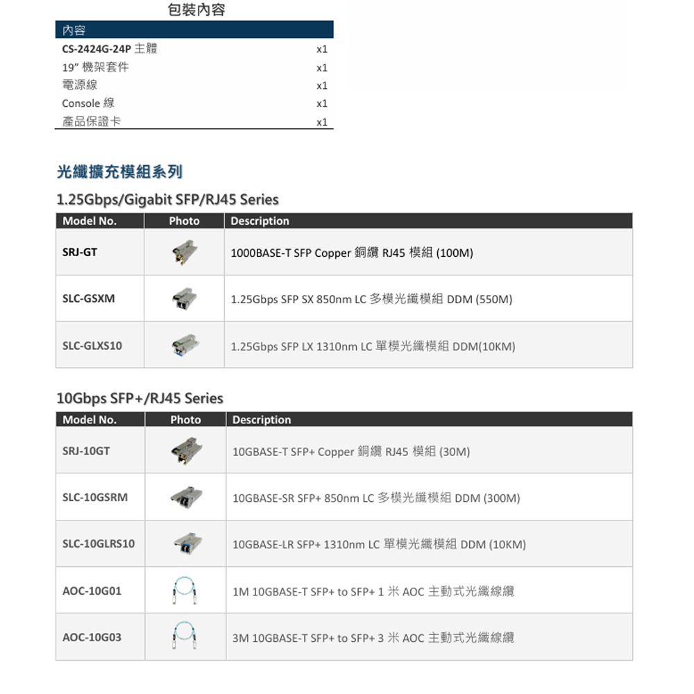 • 支援4埠 Combo Gigabit RJ45 / SFP 埠,用於高速RJ45 Gigabit Uplink連接和MiniGBIC 1000Base-SX/LX 的光纖模組連接,用於長距離網路的應用。