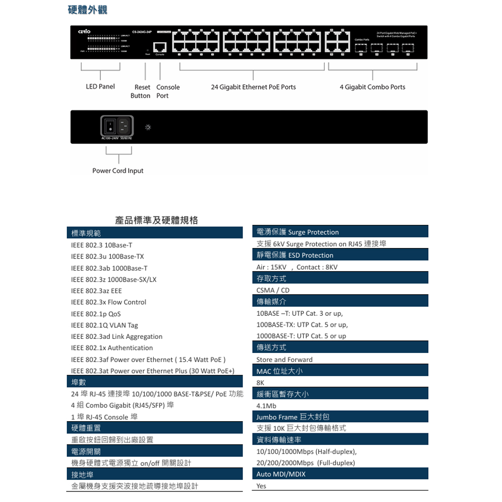 • 24埠 10/1001000Mbps Auto-Negotiation流量調變網路交換器,24埠Gigabit皆提供PSE/ PoE 供電裝置功能,並符合IEEE 802.3af class3 / class2 / class1及IEEE 802.3at class4規範。