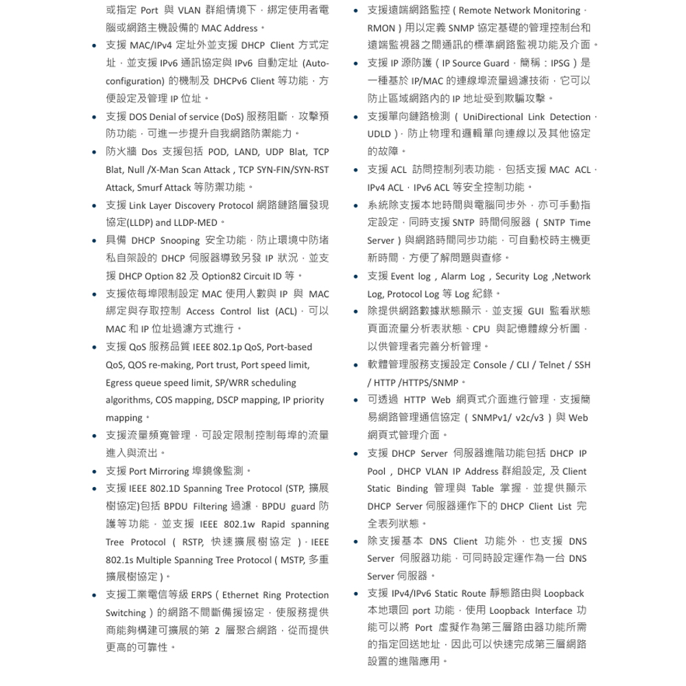 • 支援QoS服務品質IEEE 802.1p QoS, Port-based QoS, QOS re-making, Port trust, Port speed limit, Egress queue speed limit, SP/WRR scheduling algorithms, COS mapping, DSCP mapping, IP priority mapping。