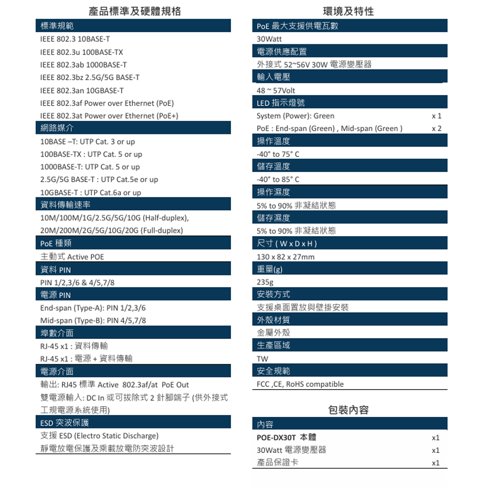 • 支援IEEE 802.3af/at POE 標準規範,搭配所附之52~56V電源變壓器,可支援PoE埠最大供電達: 30Watts (IEEE 802.3at)。