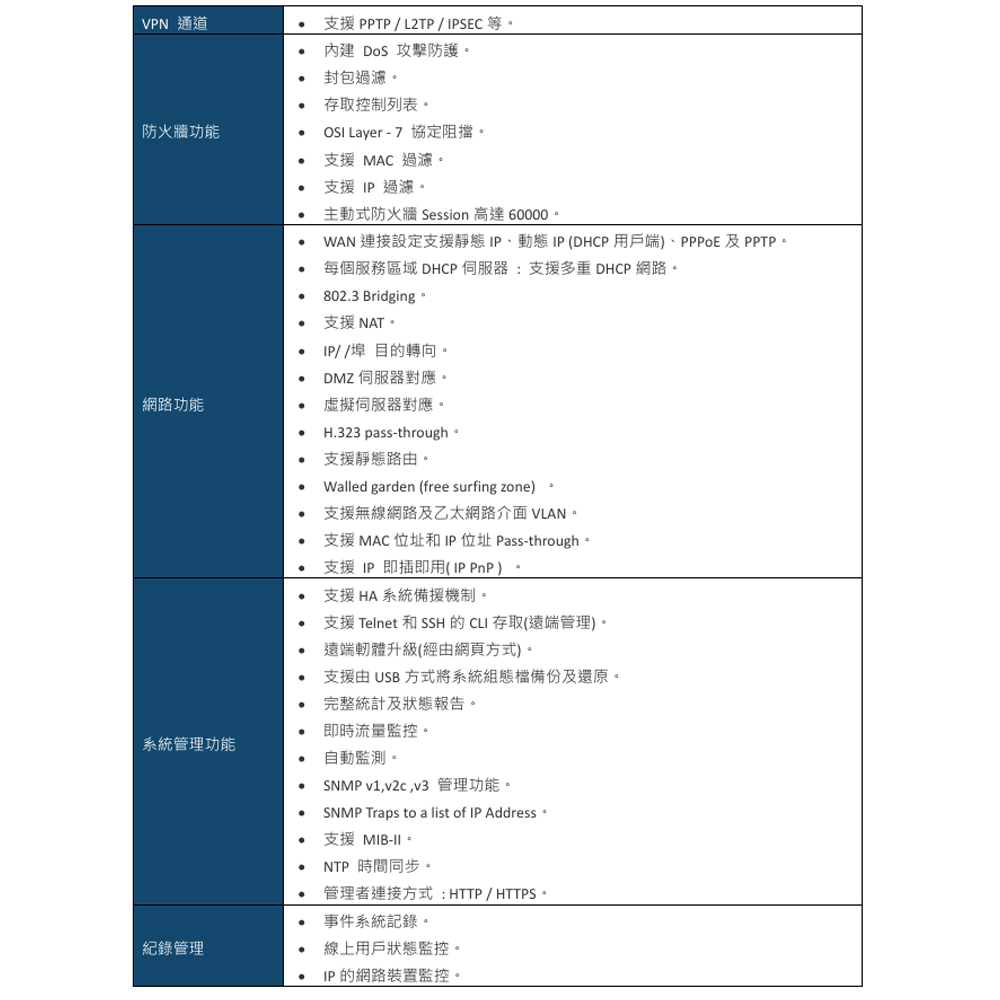 DR-3000內建基於策略性的DoS防火牆保護,以防止駭客攻擊,提高網路的安全性。