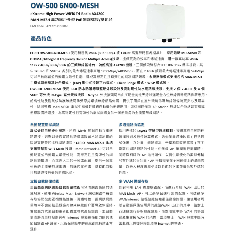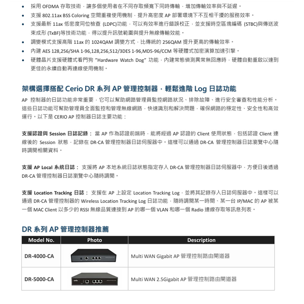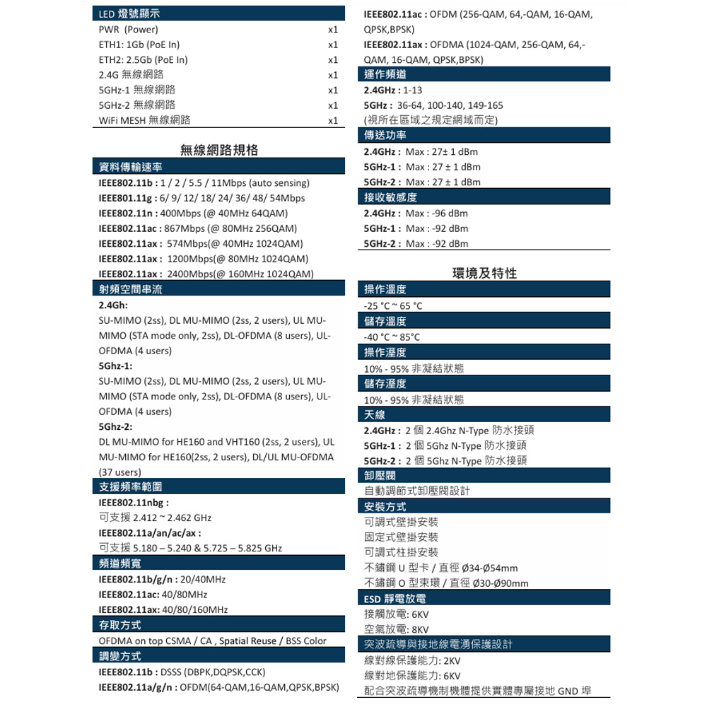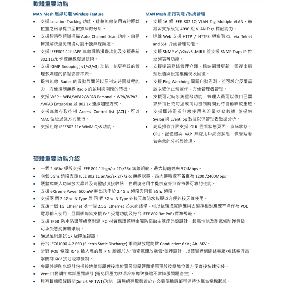 • 除支援Mesh AP骨幹中樞互連能力外,同時也支援多工的無線基地台AP站點供無線使用者WiFi存取使用。