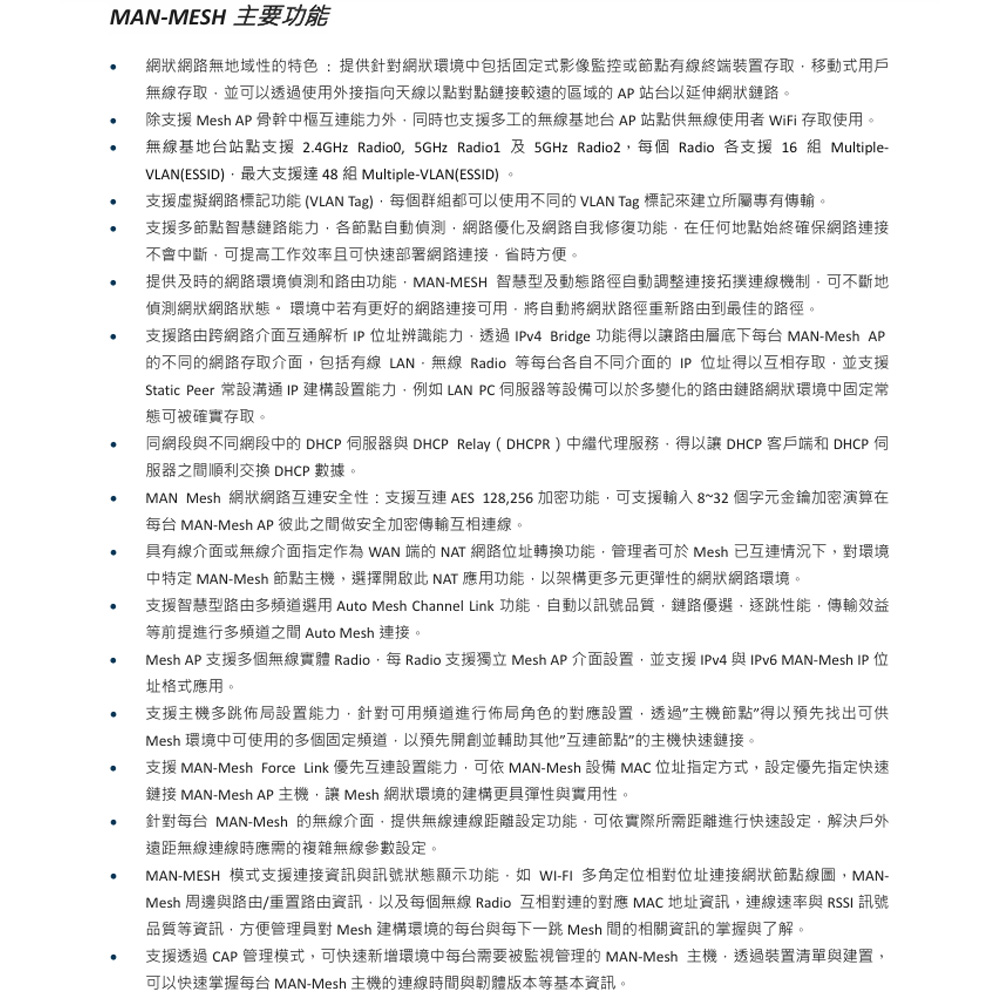 • MAN Mesh 網狀網路互連安全性:支援互連AES 128,256加密功能,可支援輸入8~32個字元金鑰加密演算在