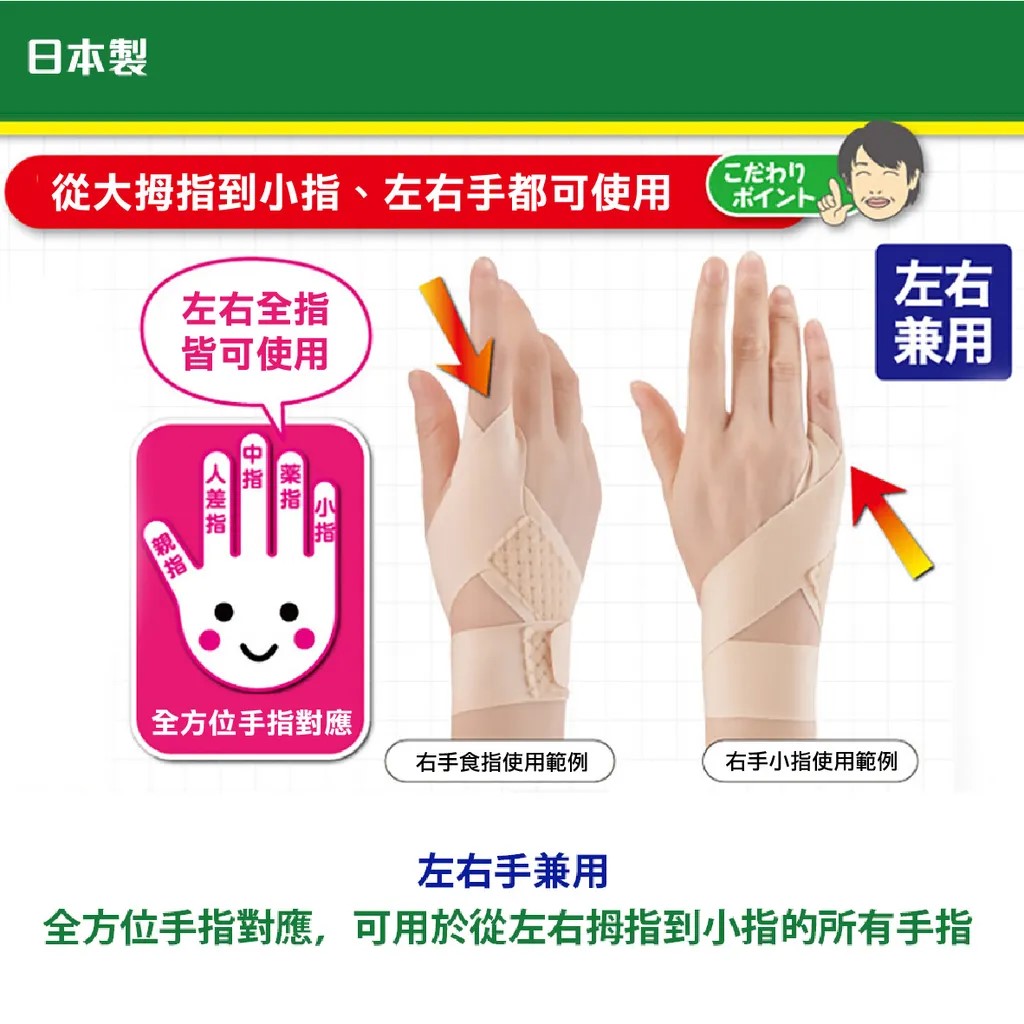 ・手の使い過ぎから起こる腱鞘炎や関節炎でお困りの方に、指と手関節の動きを保護するサポーターです。・これ1枚で左右の親指から小指まで全指対応できます。・薄くて軽くよく伸びるフリーカット素材を使用しているので、高いフィット性とサポート力があります。・薄手なのでゴム手袋の下にも装着でき、水仕事にもオススメです。・指や手首に違和感があるのに休めない仕事や家事にも活躍します。・布施接骨院 布施賢太郎先生監修【例えばこんな方に・・・】・主婦の方(家事の時に指や手首がズキッとつらい方)・赤ちゃんがいるお母さん(赤ちゃんを長時間抱っこして手首や指がつらい方)・事務仕事の方(キーボードの打ち過ぎなどで指をよく使う方)・年配の方(年齢からくる腱鞘炎、関節炎でお悩みの方)*日本布施接骨院的布施賢太郎氏醫師監製研發!*可保護因過度使用雙手引起的肌腱炎和關節炎患者手指和腕關節活動的護具。*全方位手指對應,可用於從左右拇指到小指的所有手指。*薄、輕、且具有良好伸展性的自由切割材料,提供出色的貼合性和支撐性。*輕薄特性,也可以戴在橡膠手套下,如洗碗或潮濕的工作塑膠手套下。*對於手指和手腕感到不適,但無法休息的工作和家務也很有用。*一手輕易完成穿戴,超便利。*男女適用,左右兼用!哪些人適合使用呢? 例如:1.家庭主婦(做家務時手指和手腕疼痛的人)2.有嬰兒的母親(長時間帶嬰兒後手腕和手指疼痛的人)3.上班族(因在鍵盤上打字等而經常使用手指的人)4.老年人(與年齡相關的肌腱炎和關節炎)5.重量訓練 (需支撐重訓器材的人)材 質:超彈性尼龍顏 色:米/黑腕圍14-22cm洗滌方式:請用中性洗劑,按壓手洗,水溫低於30°C /勿漂白/勿烘乾/勿熨燙/用毛巾壓去過多水分後陰乾產 地:日本製國際條碼:4985697247005米色/4985697255833黑色https://s-cf-tw.shopeesz.com/file/tw-11134208-23020-7l7mn259sunv33