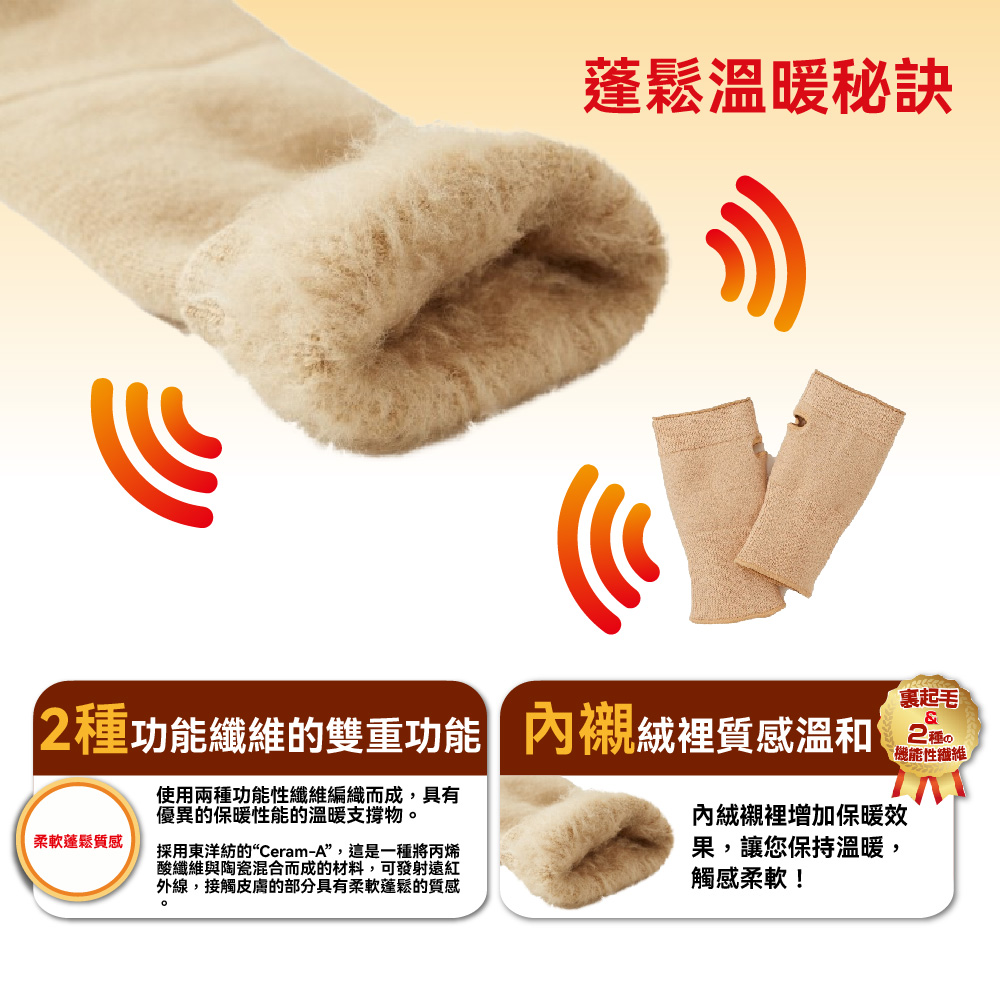 日本製【CERVIN】保暖長護腕・2種類の機能性繊維を使用して編み立てた保温性に優れたあたたかサポーター繊維の中心に温かな空気を保持することが出来る中空繊維、東レの「エアレット」を使用。 遠赤外線を放射するセラミックスをアクリル繊維に練り込んだ素材、東洋紡の「セラムA」を使用。・肌にあたる部分は裏起毛で仕上げていますのでふんわりとした優しい肌ざわりです。・冷えからくる関節のお悩みの方に、保温性のあるサポーターをつけて気になるトコロをあったかサポート・指先が自由に動かせるオープンタイプで日常の動作を妨げない仕様になっています。・手の甲・手首回りはリブ編みになっているので、着用時にフィットしてズレにくい仕様です。・手首や手が冷えやすくお困りの方に、手首の関節周りをしっかり温めてサポート・色はアウターにひびきにくいベージュを採用。使用兩種功能性纖維編織而成,具有優異的保暖性能的溫暖支撐物。採用東洋紡的“Ceram-A”,這是一種將丙烯酸纖維與陶瓷混合而成的材料,可發射遠紅外線。接觸皮膚的部分具有柔軟蓬鬆的質感。內襯提供溫暖支撐,呵護因寒冷受影響的身體部位指尖張開,可自由活動,因此不會干擾日常活動手背和手腕區域。手腕和手部冰冷的人來說,腕關節得到溫暖和支撐。《注意事項》本品不具醫療效果。請勿過度勒緊,使用中、使用後若有不適,請停止使用並諮詢醫師。就寢時請勿穿戴。請勿穿戴於有傷口、皮膚炎、皮膚發癢部位,或對橡膠製品有過敏者。請勿強力拉扯,避免損壞商品。請放置於嬰幼兒不易拿取處。請勿接近火源。使用效果因人而異。材質:壓克力*聚酯纖維*其他尺寸:手腕週長15至20厘米,手掌週長至25厘米顏色:淺褐色洗滌方式:水溫攝氏30度以下/手洗/中性洗劑/勿漂白/勿烘乾/勿熨燙/陰涼處懸掛晾乾/勿專業乾洗/輕輕擠壓過多水分後陰乾/陰涼處定型懸掛晾乾/請勿將織物長時間暴露在陽光或螢光燈下,否則可能會導致褪色/請勿擰乾織物、壓洗產地:日本製國際條碼:4985697235811