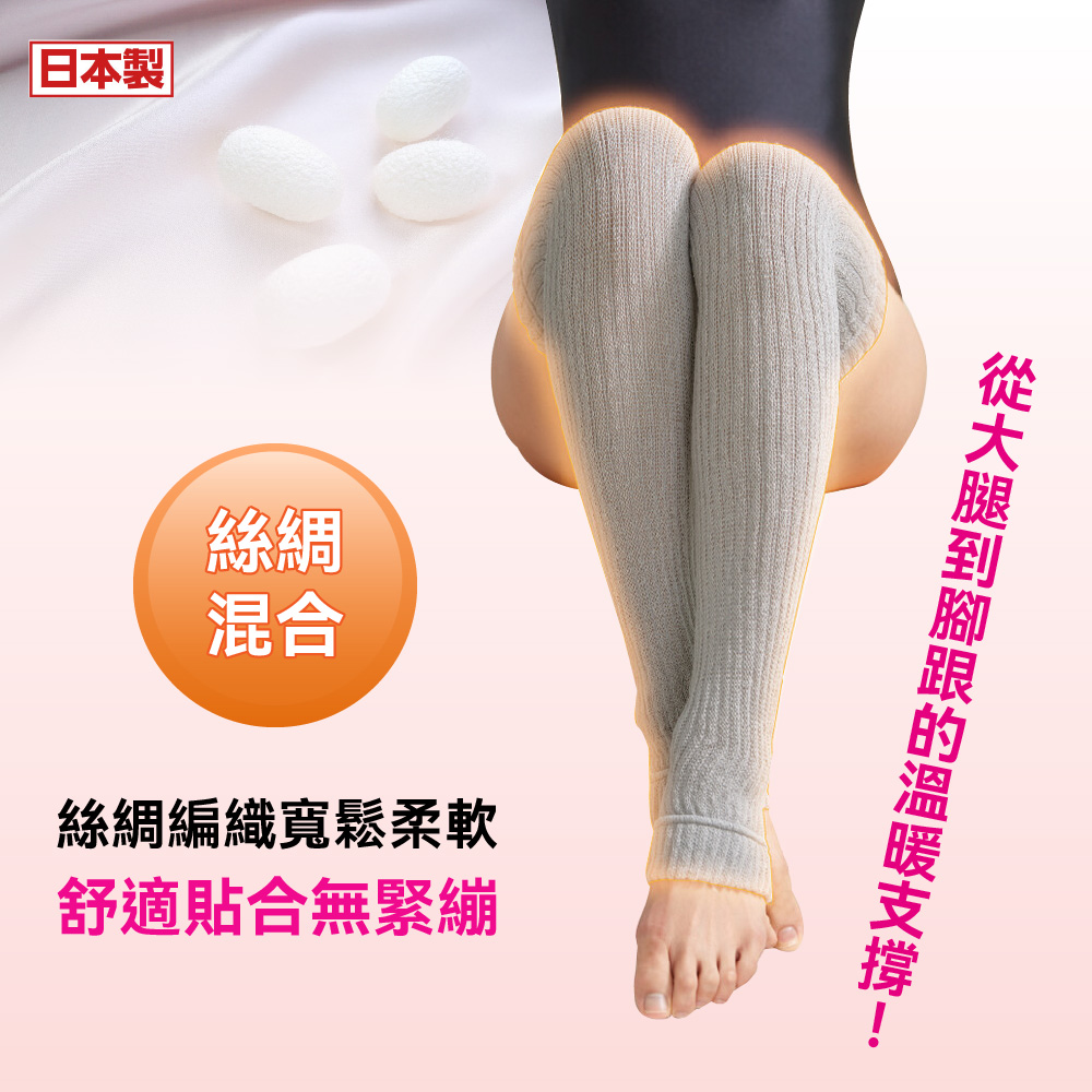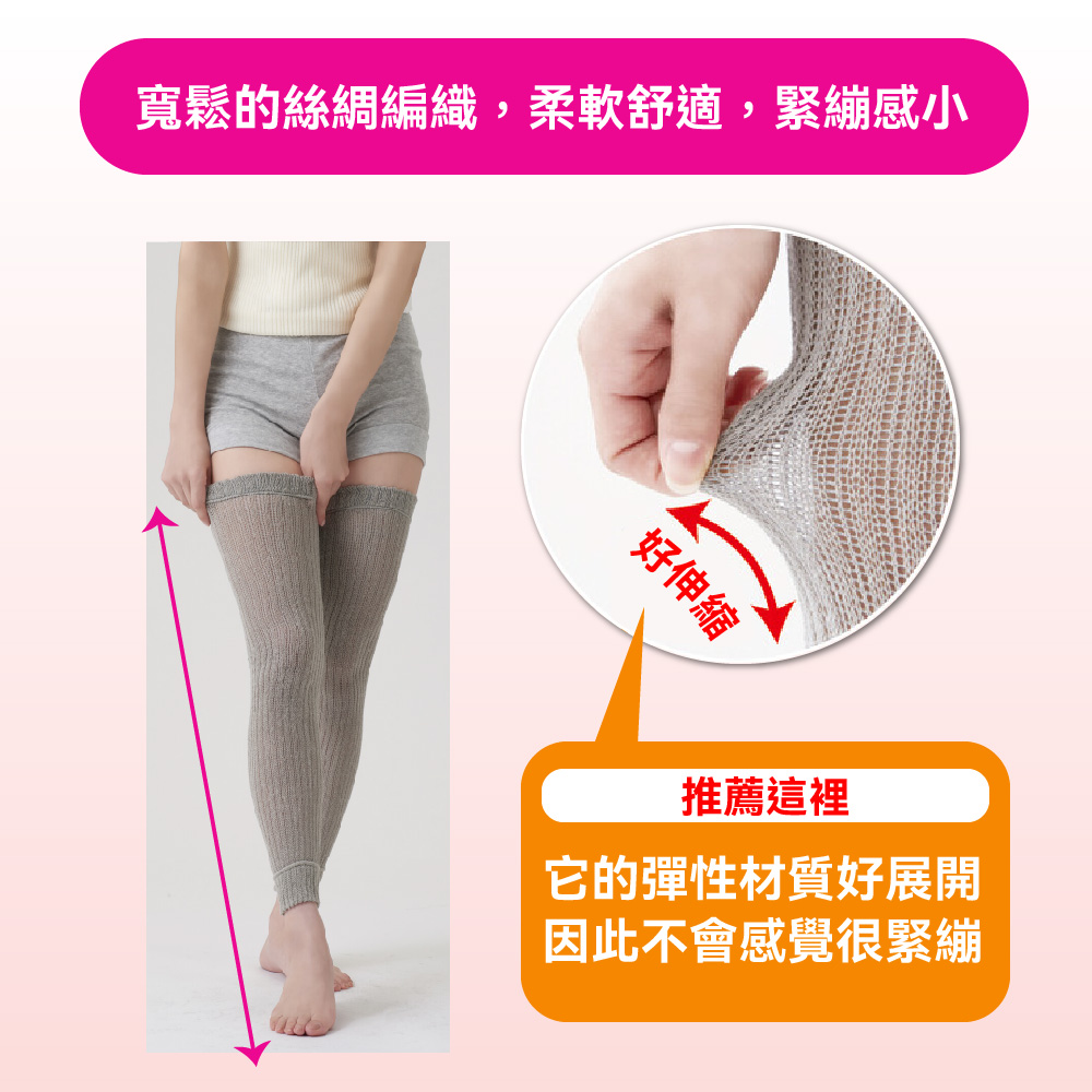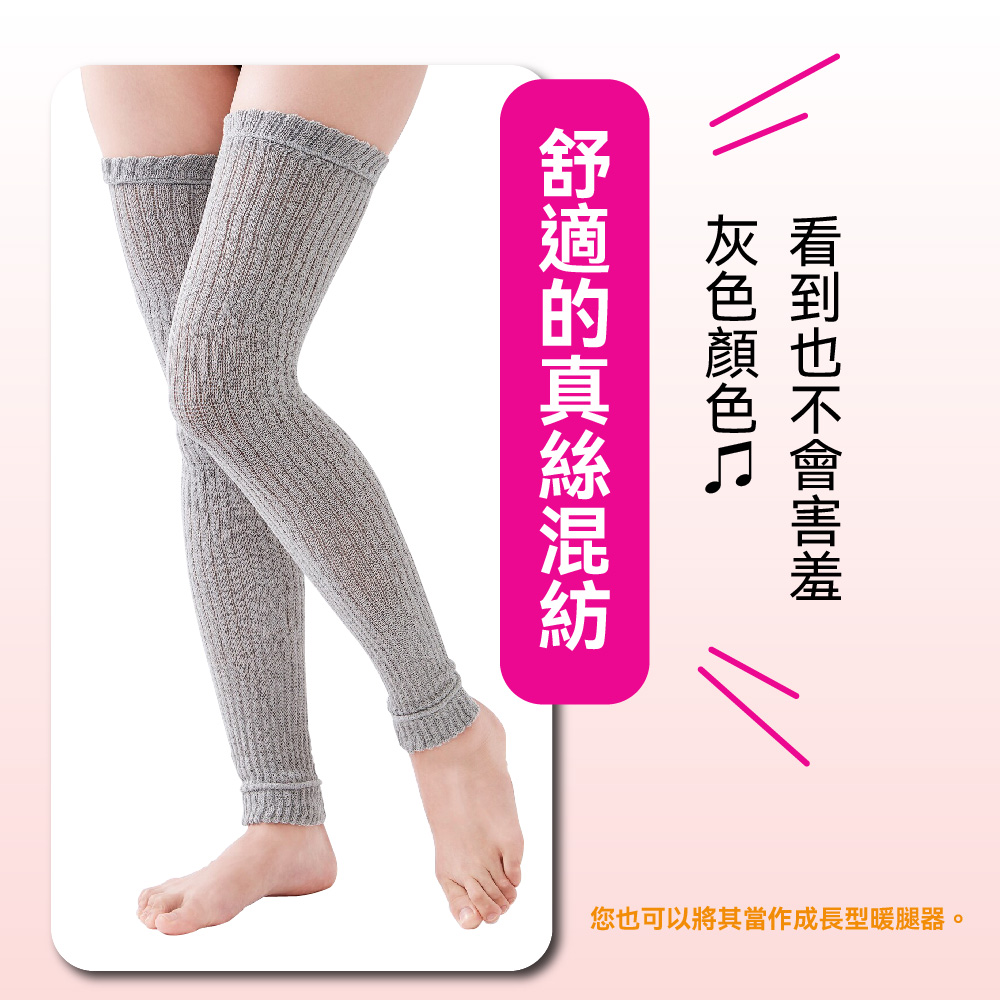 日本製【CERVIN】長筒過膝護套・シルクを使ってゆったりと編み立てていますので、締めつけ感が少なくソフトな着け心地です。・太ももからかかとまでスッポリとカバー出来るロングタイプで脚全体を暖めてくれます。・保温性・吸湿性に優れたシルク混素材を使用。肌にやさしい、心地良い肌触りです。・家事や外出先での防寒対策として、また、夏場の冷房対策やオフィスでの冷え対策としてもご活用頂けます。・足元が冷えやすい方、冷やしたくない方にオススメです。・足の甲までカバー出来ます。太ももからかかとまでサポート出来るロングタイプ。・色はグレーを採用。レッグウォーマー感覚で見えても恥かしくない色目です。*寬鬆的絲綢編織,柔軟舒適,緊繃感小。*長度足以覆蓋從大腿到腳跟的整條腿,溫暖整條腿。*採用蠶絲混紡材質製成,具有優異的吸濕性能與保暖性,對肌膚溫和,觸感舒適。*它可以用作家務或外出時的保暖措施,也可以用作辦公室或夏季空調的降溫措施。*推薦給那些容易感到冷並且不想讓自己受涼的人。*可以覆蓋到腳的頂部。可以支撐從大腿到腳跟的長款。*顏色為灰色,即使你想穿暖腿褲,顏色也不會尷尬。《注意事項》本品不具醫療效果。請勿過度勒緊,使用中、使用後若有不適,請停止使用並諮詢醫師。就寢時請勿穿戴。請勿穿戴於有傷口、皮膚炎、皮膚發癢部位,或對橡膠製品有過敏者。請勿強力拉扯,避免損壞商品。請放置於嬰幼兒不易拿取處。請勿接近火源。使用效果因人而異。材質:絲*聚酯纖維*其他尺寸:適合大腿圍30-50cm顏色:灰色洗滌方式:水溫攝氏30度以下/手洗/中性洗劑/勿漂白/勿烘乾/勿熨燙/陰涼處懸掛晾乾/勿專業乾洗/輕輕擠壓過多水分後陰乾/陰涼處定型懸掛晾乾/請勿將織物長時間暴露在陽光或螢光燈下,否則可能會導致褪色/請勿擰乾織物、壓洗產地:日本製國際條碼:4985697235781