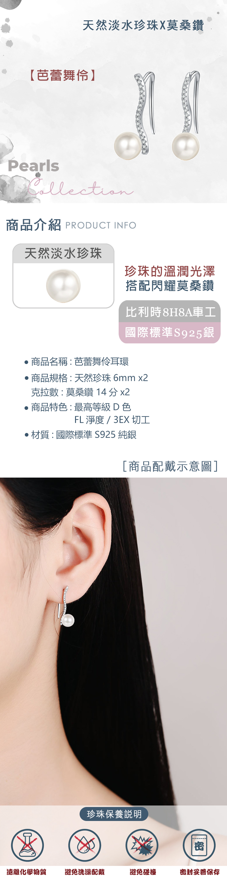 【CF鑽飾|CF Diamond】 頂級CF鑽:火彩、亮度、均比鑽石更閃耀、燦爛 ●商品規格: 天然淡水珍珠x莫桑鑽 ●珍珠規格:6mm ●主鑽克拉數 : 14分 ●商品特色:最高等級D色 / FL淨度 / 3EX切工 ★切工:八心八箭邱比特比利時切工,完美切割57個切面,璀璨光芒 ★材質:國際標準S925純銀,抗過敏,抗氧化 ★配鑽:小鑽款式 商品標準配備: -附專用拭銀布 -原廠精美歐式禮盒、提袋,送禮自用兩相宜 【購買注意事項】 -因人工測量及於電腦螢幕色差等非人為因素,商品實際尺寸&顏色可能存在微小差異,請以收到實際商品為主! 【貼心小提醒】 -銀製飾品會因接觸到空氣、汗水氧化時而變黑時,可使用拭銀布擦拭,立即恢復它的光澤亮麗色彩 -請勿浸泡溫泉水及化學藥劑、清潔劑之中 -因拭銀布本身有藥劑,使用完畢後記得洗手!!