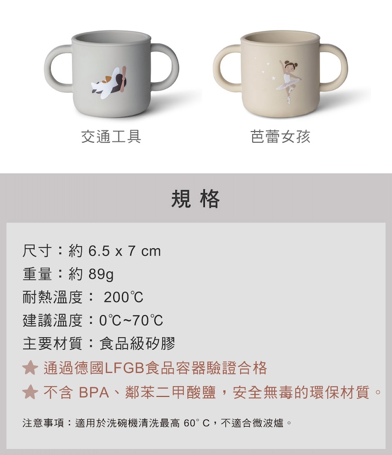 ✔通過德國LFGB食品容器驗證合格✔不含 BPA ✔寶寶學習獨立喝水,同時訓練手部小肌肉發展✔防滑手柄易於寶寶抓握✔堅固的底座有助於防止杯子翻倒✔容量可滿足寶寶日常喝水的需求✔精緻時尚的圖案,輕鬆融入家中的擺飾✔適用於洗碗機清洗容量:180ml重量:89g尺寸:6.5cm x 7cm 材質:矽膠