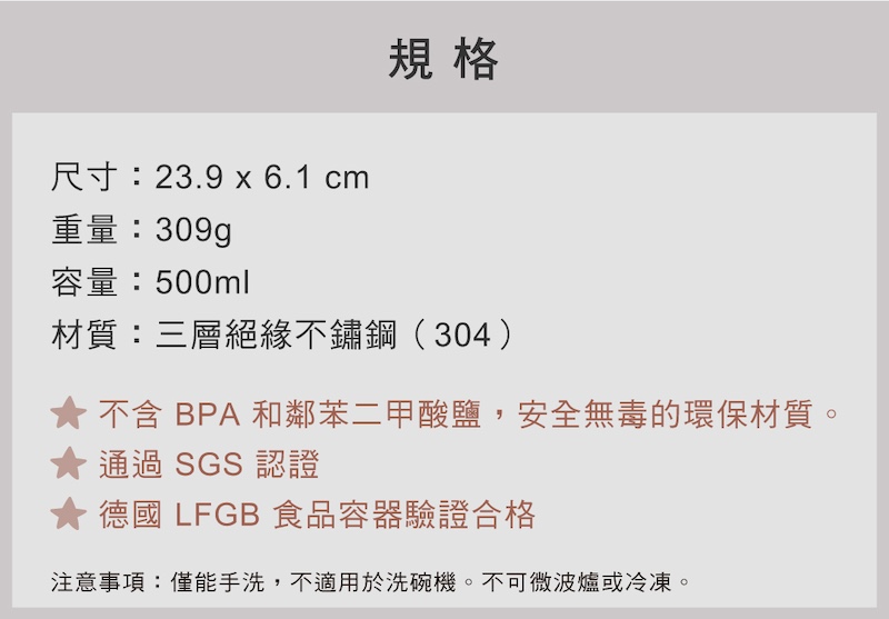 ✔通過SGS 認證德國LFGB食品容器驗證合格✔三層絕緣不鏽鋼 (304)✔防漏設計✔保持水冷長達 24 小時,熱水長達 12 小時✔包括兩根吸管和一個清潔刷✔可拆式矽膠提把,較易清潔保養✔不含 BPA 和鄰苯二甲酸鹽的材料可確保您的安全✔僅能手洗。不適用於洗碗機、微波爐或冷凍