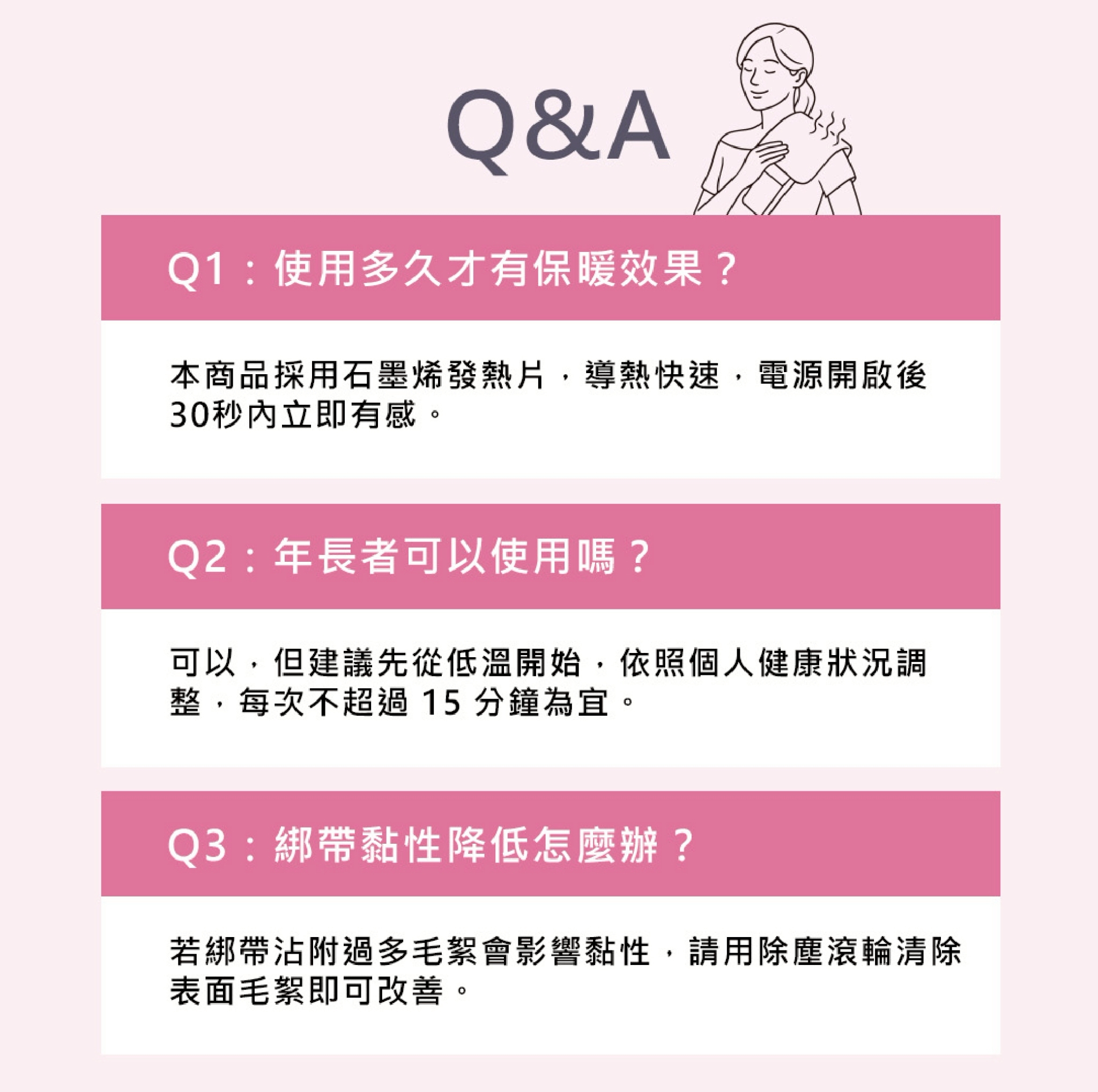 採用獨家技術開發之輕薄型發熱元件,柔軟服貼,適用於肩頸、腰腹、關節等多處部位,隨時享受溫熱舒緩