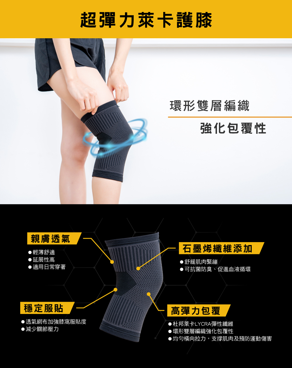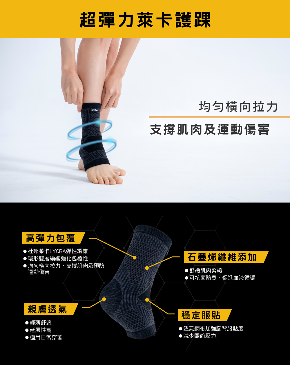 環形雙層編織強化彈性,穩定包覆關節部位 輕薄舒適,延展性高,不含乳膠成分,可安心使用 透氣網布加強腳背服貼度,減少關節壓力 均勻橫向拉力,支撐肌肉及預防運動傷害