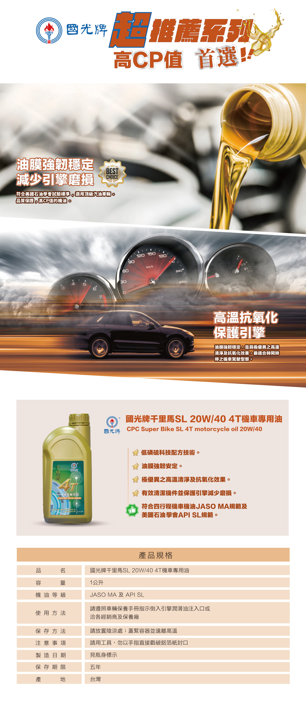 |CPC國光牌|千里馬4T機車專用油SL 20W/40 0.8L*12罐/箱
