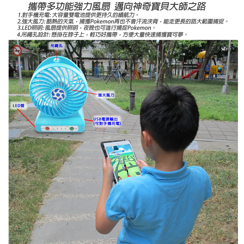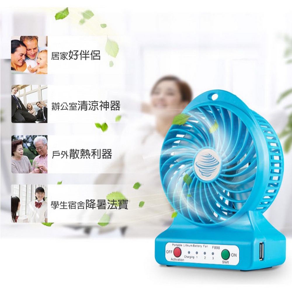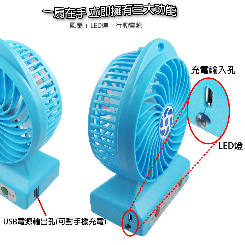 《商品介紹》送大容量鋰電池x2+充電線+吊繩四大好禮風速加倍,雙電池電量再加倍夏日居家或郊遊外出的最佳良伴超強風力,3段變速可充電式風扇雙電池設計,使用時間更長馬達再精進,風速再加倍戶外活動的好涼伴輕巧好攜帶,酷夏降溫神器綠色環保,清涼消暑四角緊密保護防撞,減緩碰撞衝擊雙電池設計,使用時間更長馬達再精進,風速再加倍超強馬達馬力,轉速極快,提供強大風力風扇有三段轉速調節:弱中強可USB供電,也可由鋰電池供電輕巧好攜帶,可以手持或座立可以一邊充電,一邊享受風扇的涼爽使用一般USB +5V供電使用方便,操作簡單夜晚時,可以打開LED燈照明時尚設計,有吊繩孔,可吊掛或架立可拆卸式電池,隨時可更換電池居家辦公,外出郊遊都適宜本產品雖已設計多項安全防護,仍然建議未成年的兒童,需有家長陪伴使用!!!使用本產品時,請勿讓幼兒拿的到或玩耍,以免造成危險!!!