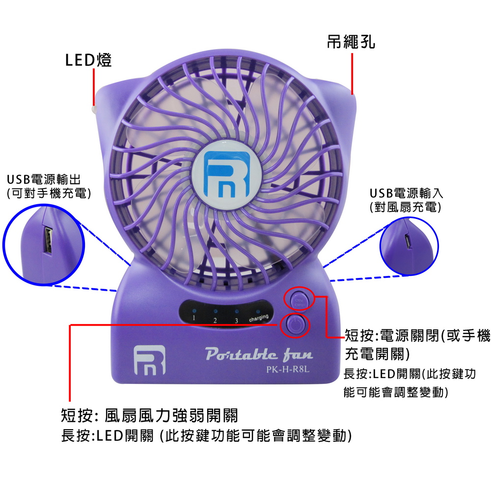 《商品介紹》送大容量鋰電池x2+充電線+吊繩四大好禮風速加倍,雙電池電量再加倍夏日居家或郊遊外出的最佳良伴超強風力,3段變速可充電式風扇雙電池設計,使用時間更長馬達再精進,風速再加倍強力風扇+手機充電+LED照明+吊繩四大功能戶外活動的好涼伴輕巧好攜帶,酷夏降溫神器綠色環保,清涼消暑四角緊密保護防撞,減緩碰撞衝擊雙電池設計,使用時間更長馬達再精進,風速再加倍強力風扇+手機充電+LED燈+吊繩 四大功能超強馬達馬力,轉速極快,提供強大風力風扇有三段轉速調節:弱中強可USB供電,也可由鋰電池供電輕巧好攜帶,可以手持或座立可以一邊充電,一邊享受風扇的涼爽使用一般USB +5V供電使用方便,操作簡單外出時,可以緊急對手機充電夜晚時,可以打開LED燈照明時尚設計,有吊繩孔,可吊掛或架立可拆卸式電池,隨時可更換電池居家辦公,外出郊遊都適宜本產品雖已設計多項安全防護,仍然建議未成年的兒童,需有家長陪伴使用!!!使用本產品時,請勿讓幼兒拿的到或玩耍,以免造成危險!!!