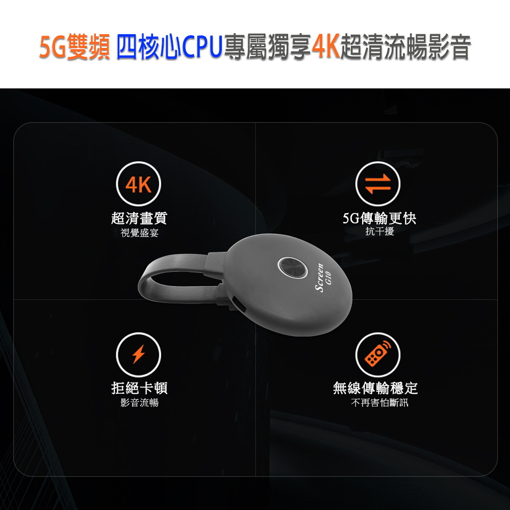 【第10代Screen G10四核心】高清4K款圓形雙頻5G全自動無線影音電視棒(附4大好禮)