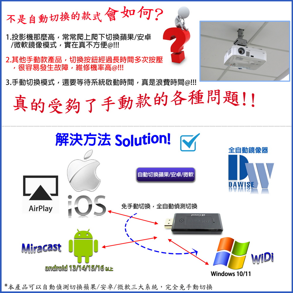 《商品特色》真正高畫質無線影音傳輸支持H.265高畫質無線投影操作簡單 影音投影■支援4K(3840×2160)超高清畫質■免安裝任何軟體■無線連結,影音同步分享■支援蘋果/安卓/電腦無線投影顯示■可電腦直接電視同步顯示■支持Airplay/Miracast/WIDI/DLNA影音同步傳輸模式《商品介紹》隨著智慧型裝置普及,手機、平板、電腦已成為日常不可或缺的工具。但螢幕太小往往影響學習與娛樂體驗。現在,只要一個 無線投影器,就能輕鬆將螢幕畫面同步到電視或投影機,大螢幕享受更清晰、更震撼!隨插即投:操作簡單,免驅動免APP。跨平台支援:支援 iOS / Android / Windows / Mac OS。高畫質輸出:清晰畫質 ,清晰不卡頓。穩定傳輸:低延遲設計,影音同步。輕巧便攜:出差、上課、居家,一機搞定。【應用場景】居家娛樂:追劇、看電影,大螢幕更沉浸。遊戲對戰:手機秒變遊戲主機,刺激加倍。教育教學:課堂同步投影,互動更生動。會議簡報:商務展示更專業,告別繁瑣連線。汽車導航:手機地圖投影到大螢幕,安全又直觀。《注意事項》1.如果要使用在汽車的螢幕投影,請先確認汽車是否有HDMI或AV影音輸入,請確認後再進行購買。2. 本商品是HDMI影音傳輸介面,如果是汽車是AV(黃白紅三色插孔)則需要另外自行準備HDMI轉AV的轉換器才可以使用。《商品配備》無線影音鏡像傳輸器 x1WiFi模組線x1說明書 x14大好禮: USB充電器x1 + HDMI傳輸線x1 + HDMI母對母轉接頭x1 + 手機支架x1《商品規格》廠牌: Dawise型號: 第十代E6顏色: 黑支援的設備: 蘋果,安卓,微軟裝置支援影音同步傳輸模式: AirPlay/Miracast/DLNA/WIDIUSB供電(DC+5V)HDMI連接電視產地: 中國大陸產品保固: 主機保固3個月,配件/贈品保固1個月,保固範圍不包含人為損壞。《NCC認證字號》 CCAJ15LP0240T0