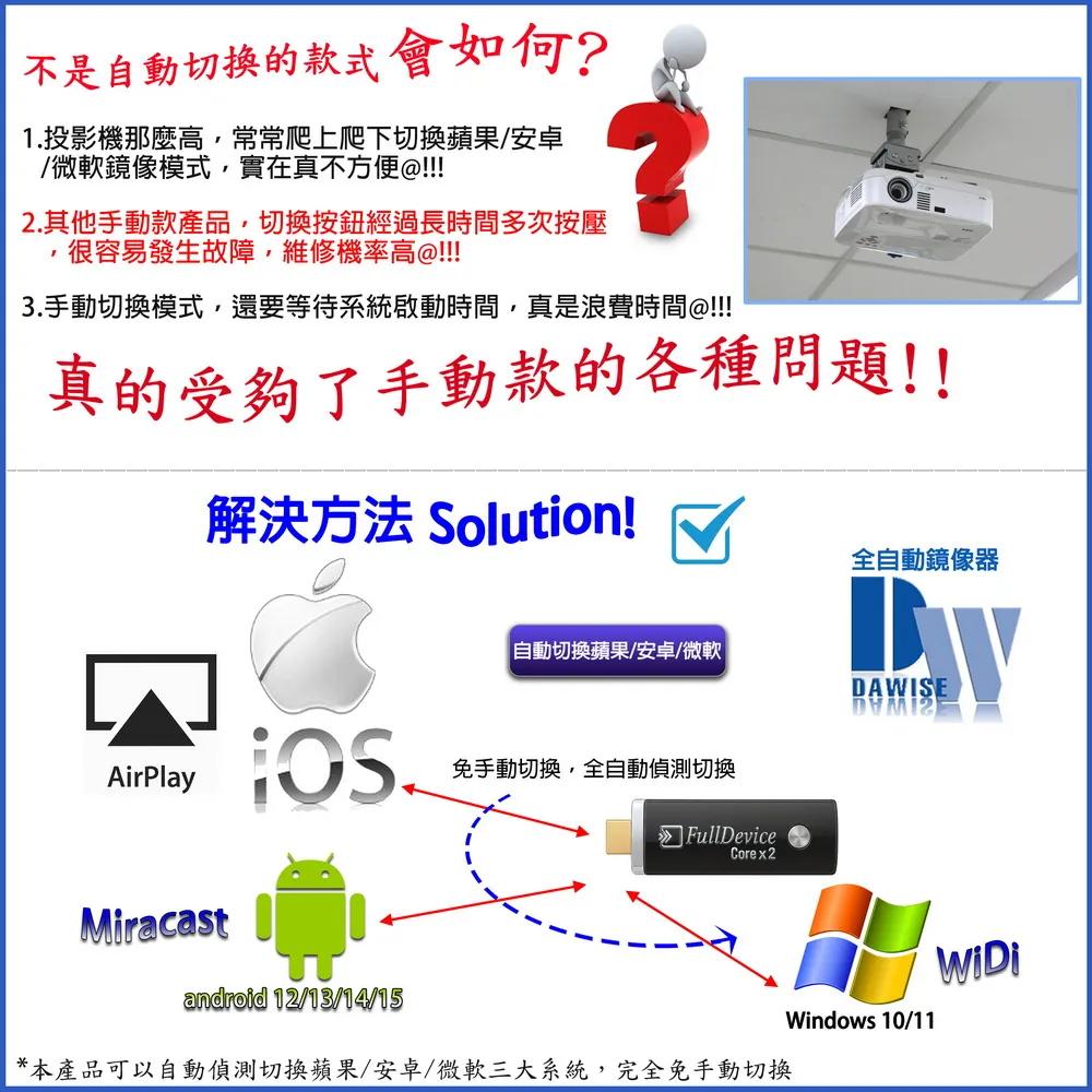 隨時隨地大螢幕娛樂操作簡單影音投影一機多用,教學娛樂導航全搞定免安裝任何軟體無線連結,影音同步分享支援蘋果/安卓/電腦無線投影可電腦直接電視同步顯示高畫質輸出,高速穩定傳輸《商品介紹》隨著智慧型裝置普及,手機、平板、電腦已成為日常不可或缺的工具。但螢幕太小往往影響學習與娛樂體驗。現在,只要一個 無線投影器,就能輕鬆將螢幕畫面同步到電視或投影機,大螢幕享受更清晰、更震撼!隨插即投:操作簡單,免驅動免APP。跨平台支援:支援 iOS / Android / Windows / Mac OS。高畫質輸出:支援 Full HD ,清晰不卡頓。穩定傳輸:低延遲設計,影音同步。輕巧便攜:出差、上課、居家,一機搞定。【應用場景】居家娛樂:追劇、看電影,大螢幕更沉浸。遊戲對戰:手機秒變遊戲主機,刺激加倍。教育教學:課堂同步投影,互動更生動。會議簡報:商務展示更專業,告別繁瑣連線。汽車導航:手機地圖投影到大螢幕,安全又直觀。《注意事項》1.如果要使用在汽車的螢幕投影,請先確認汽車是否有HDMI或AV影音輸入,請確認後再進行購買。2. 本商品是HDMI影音傳輸介面,如果是汽車是AV(黃白紅三色插孔)則需要另外自行準備HDMI轉AV的轉換器才可以使用。《商品配備》無線影音鏡像傳輸器 x1說明書 x14大好禮: USB充電器x1 + USB供電線x1 + HDMI延長線x1 + (手機支架x1 或 指環扣x1 兩款隨機出貨其中一款)《商品規格》廠牌: Dawise型號: 八代WD37顏色: 黑支援的設備: 蘋果,安卓,微軟裝置支援影音同步傳輸模式: AirPlay/Miracast/DLNA/WIDIUSB供電(DC+5V)HDMI連接電視產地: 中國產品保固: 主機保固3個月,配件/贈品保固1個月,保固範圍不包含人為損壞。《注意事項:》產品顏色可能會因為相機拍照色偏因素而有差異,請以實際出貨為準。《NCC認證字號》 CCAJ15LP0825T2