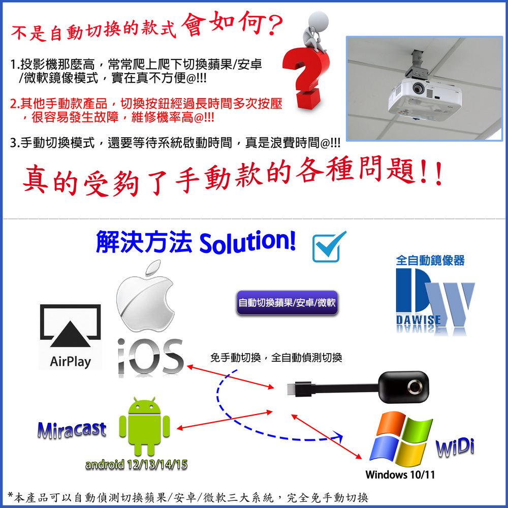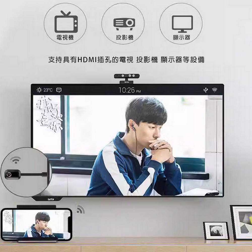《商品特色》真正高畫質無線影音傳輸支持H.265高畫質無線投影操作簡單 影音投影■支援高清畫質解析度■免安裝任何軟體■無線連結,影音同步分享■支援蘋果/安卓/電腦無線投影顯示■可電腦直接電視同步顯示■支持Airplay/Miracast/WIDI/DLNA影音同步傳輸模式《商品介紹》隨著智慧型裝置普及,手機、平板、電腦已成為日常不可或缺的工具。但螢幕太小往往影響學習與娛樂體驗。現在,只要一個 無線投影器,就能輕鬆將螢幕畫面同步到電視或投影機,大螢幕享受更清晰、更震撼!隨插即投:操作簡單,免驅動免APP。跨平台支援:支援 iOS / Android / Windows / Mac OS。高畫質輸出:清晰畫質 ,清晰不卡頓。穩定傳輸:低延遲設計,影音同步。輕巧便攜:出差、上課、居家,一機搞定。【應用場景】居家娛樂:追劇、看電影,大螢幕更沉浸。遊戲對戰:手機秒變遊戲主機,刺激加倍。教育教學:課堂同步投影,互動更生動。會議簡報:商務展示更專業,告別繁瑣連線。汽車導航:手機地圖投影到大螢幕,安全又直觀。《注意事項》1.如果要使用在汽車的螢幕投影,請先確認汽車是否有HDMI或AV影音輸入,請確認後再進行購買。2. 本商品是HDMI影音傳輸介面,如果是汽車是AV(黃白紅三色插孔)則需要另外自行準備HDMI轉AV的轉換器才可以使用。《商品配備》無線影音鏡像傳輸器 x1WIFI模組線x1說明書 x15大好禮: USB充電器x1 + HDMI影音線x1 + HDMI母對母轉接頭x1 + 手機支架x1 +手機指環扣x1《商品規格》廠牌: Dawise型號: 11代E6顏色: 黑支援的設備: 蘋果,安卓,微軟裝置支援影音同步傳輸模式: AirPlay/Miracast/DLNA/WIDIUSB供電(DC+5V)HDMI連接電視產地: 中國大陸產品保固: 主機保固3個月,配件/贈品保固1個月,保固範圍不包含人為損壞。《NCC認證字號》CCAJ15LP0823T1
