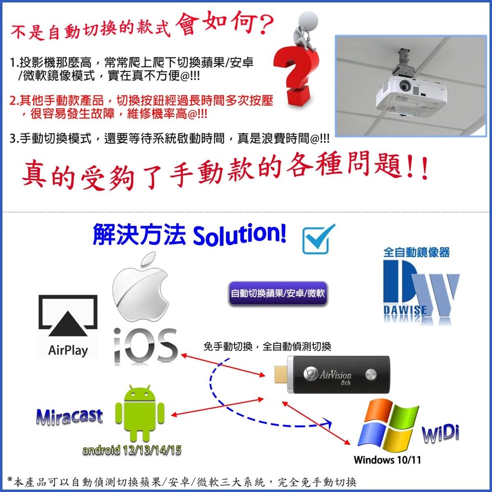 隨時隨地大螢幕娛樂操作簡單影音投影一機多用,教學娛樂導航全搞定免安裝任何軟體無線連結,影音同步分享支援蘋果/安卓/電腦無線投影可電腦直接電視同步顯示高畫質輸出,高速穩定傳輸《商品介紹》隨著智慧型裝置普及,手機、平板、電腦已成為日常不可或缺的工具。但螢幕太小往往影響學習與娛樂體驗。現在,只要一個 無線投影器,就能輕鬆將螢幕畫面同步到電視或投影機,大螢幕享受更清晰、更震撼!隨插即投:操作簡單,免驅動免APP。跨平台支援:支援 iOS / Android / Windows / Mac OS。高畫質輸出:支援 Full HD ,清晰不卡頓。穩定傳輸:低延遲設計,影音同步。輕巧便攜:出差、上課、居家,一機搞定。【應用場景】居家娛樂:追劇、看電影,大螢幕更沉浸。遊戲對戰:手機秒變遊戲主機,刺激加倍。教育教學:課堂同步投影,互動更生動。會議簡報:商務展示更專業,告別繁瑣連線。汽車導航:手機地圖投影到大螢幕,安全又直觀。《注意事項》1.如果要使用在汽車的螢幕投影,請先確認汽車是否有HDMI或AV影音輸入,請確認後再進行購買。2. 本商品是HDMI影音傳輸介面,如果是汽車是AV(黃白紅三色插孔)則需要另外自行準備HDMI轉AV的轉換器才可以使用。《商品配備》無線影音鏡像傳輸器 x1說明書 x14大好禮: USB充電器x1 + USB供電線x1 + HDMI延長線x1 + (手機支架x1 或 指環扣x1 兩款隨機出貨其中一款)《商品規格》廠牌: Dawise型號: 八代WD39顏色: 黑支援的設備: 蘋果,安卓,微軟裝置支援影音同步傳輸模式: AirPlay/Miracast/DLNA/WIDIUSB供電(DC+5V)HDMI連接電視產地: 中國產品保固: 主機保固3個月,配件/贈品保固1個月,保固範圍不包含人為損壞。《注意事項:》產品顏色可能會因為相機拍照色偏因素而有差異,請以實際出貨為準。《NCC認證字號》 CCAJ15LP0827T6