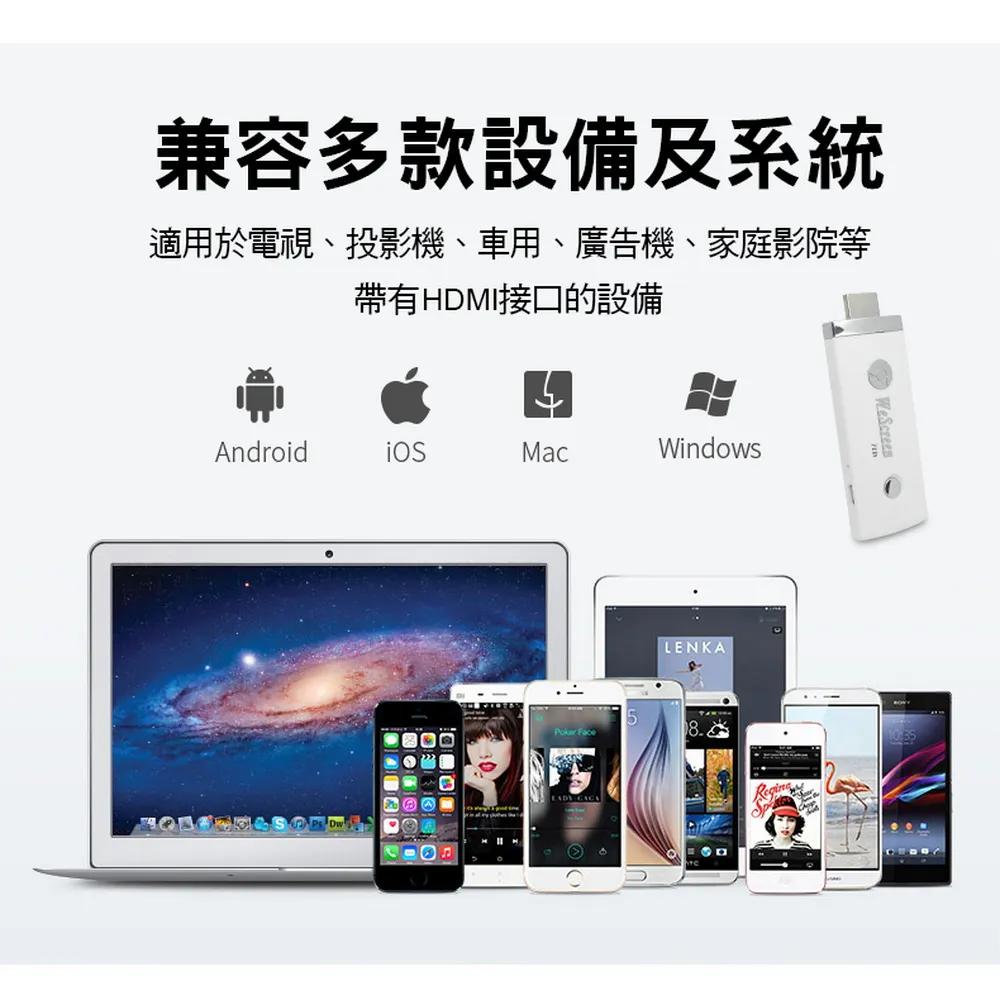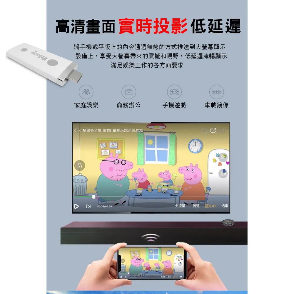隨時隨地大螢幕娛樂操作簡單影音投影一機多用,教學娛樂導航全搞定免安裝任何軟體無線連結,影音同步分享支援蘋果/安卓/電腦無線投影可電腦直接電視同步顯示高畫質輸出,高速穩定傳輸《商品介紹》隨著智慧型裝置普及,手機、平板、電腦已成為日常不可或缺的工具。但螢幕太小往往影響學習與娛樂體驗。現在,只要一個 無線投影器,就能輕鬆將螢幕畫面同步到電視或投影機,大螢幕享受更清晰、更震撼!隨插即投:操作簡單,免驅動免APP。跨平台支援:支援 iOS / Android / Windows / Mac OS。高畫質輸出:支援 Full HD ,清晰不卡頓。穩定傳輸:低延遲設計,影音同步。輕巧便攜:出差、上課、居家,一機搞定。【應用場景】居家娛樂:追劇、看電影,大螢幕更沉浸。遊戲對戰:手機秒變遊戲主機,刺激加倍。教育教學:課堂同步投影,互動更生動。會議簡報:商務展示更專業,告別繁瑣連線。汽車導航:手機地圖投影到大螢幕,安全又直觀。《注意事項》1.如果要使用在汽車的螢幕投影,請先確認汽車是否有HDMI或AV影音輸入,請確認後再進行購買。2. 本商品是HDMI影音傳輸介面,如果是汽車是AV(黃白紅三色插孔)則需要另外自行準備HDMI轉AV的轉換器才可以使用。《商品配備》無線影音鏡像傳輸器 x1說明書 x14大好禮: HDMI延長線x1 + Micro USB充電線x1 + USB充電器 x1 + 手機支架x1《商品規格》廠牌: Dawise型號: 七代WD38顏色: 白支援的設備: 蘋果,安卓,微軟裝置支援影音同步傳輸模式: AirPlay/Miracast/DLNA/WIDIUSB供電(DC+5V)HDMI連接電視產地: 中國大陸產品保固: 主機保固3個月,配件/贈品保固1個月,保固範圍不包含人為損壞。《NCC認證字號》 CCAJ15LP0826T4