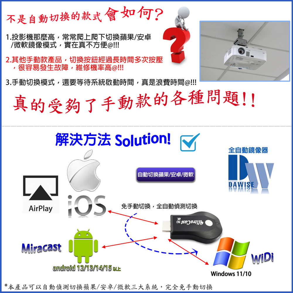 《商品特色》真正高畫質無線影音傳輸支持高畫質無線投影操作簡單 影音投影■支援超高清畫質■免安裝任何軟體■無線連結,影音同步分享■支援蘋果/安卓/電腦無線投影顯示■可電腦直接電視同步顯示■支持Airplay/Miracast/WIDI/DLNA影音同步傳輸模式《商品介紹》隨著智慧型裝置普及,手機、平板、電腦已成為日常不可或缺的工具。但螢幕太小往往影響學習與娛樂體驗。現在,只要一個 無線投影器,就能輕鬆將螢幕畫面同步到電視或投影機,大螢幕享受更清晰、更震撼!隨插即投:操作簡單,免驅動免APP。跨平台支援:支援 iOS / Android / Windows / Mac OS。高畫質輸出:清晰畫質 ,清晰不卡頓。穩定傳輸:低延遲設計,影音同步。輕巧便攜:出差、上課、居家,一機搞定。【應用場景】居家娛樂:追劇、看電影,大螢幕更沉浸。遊戲對戰:手機秒變遊戲主機,刺激加倍。教育教學:課堂同步投影,互動更生動。會議簡報:商務展示更專業,告別繁瑣連線。汽車導航:手機地圖投影到大螢幕,安全又直觀。《注意事項》1.如果要使用在汽車的螢幕投影,請先確認汽車是否有HDMI或AV影音輸入,請確認後再進行購買。2. 本商品是HDMI影音傳輸介面,如果是汽車是AV(黃白紅三色插孔)則需要另外自行準備HDMI轉AV的轉換器才可以使用。《商品配備》無線影音鏡像傳輸器 x1WiFi模組線x1說明書 x14大好禮: USB充電器x1 + HDMI傳輸線x1 + HDMI母對母轉接頭x1 + 手機支架x1《商品規格》廠牌: Dawise型號: 第10代WD66顏色: 黑支援的設備: 蘋果,安卓,微軟裝置支援影音同步傳輸模式: AirPlay/Miracast/DLNA/WIDIUSB供電(DC+5V)HDMI連接電視產地: 中國大陸產品保固: 主機保固3個月,配件/贈品保固1個月,保固範圍不包含人為損壞。《NCC認證字號》CCAJ14LP398FT7
