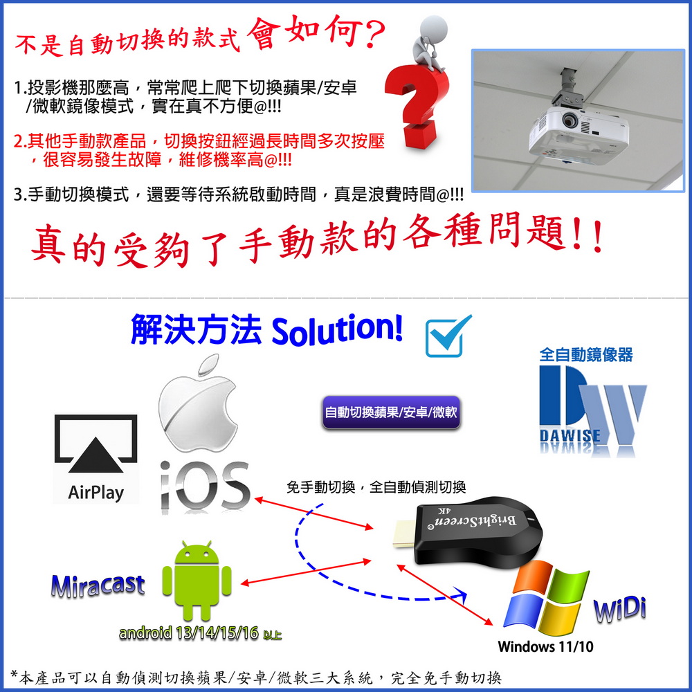 《商品特色》真正高畫質無線影音傳輸支持H.265高畫質無線投影操作簡單 影音投影■支援4K(3840×2160)超高清畫質■免安裝任何軟體■無線連結,影音同步分享■支援蘋果/安卓/電腦無線投影顯示■可電腦直接電視同步顯示■支持Airplay/Miracast/WIDI/DLNA影音同步傳輸模式《商品介紹》隨著智慧型裝置普及,手機、平板、電腦已成為日常不可或缺的工具。但螢幕太小往往影響學習與娛樂體驗。現在,只要一個 無線投影器,就能輕鬆將螢幕畫面同步到電視或投影機,大螢幕享受更清晰、更震撼!隨插即投:操作簡單,免驅動免APP。跨平台支援:支援 iOS / Android / Windows / Mac OS。高畫質輸出:清晰畫質 ,清晰不卡頓。穩定傳輸:低延遲設計,影音同步。輕巧便攜:出差、上課、居家,一機搞定。【應用場景】居家娛樂:追劇、看電影,大螢幕更沉浸。遊戲對戰:手機秒變遊戲主機,刺激加倍。教育教學:課堂同步投影,互動更生動。會議簡報:商務展示更專業,告別繁瑣連線。汽車導航:手機地圖投影到大螢幕,安全又直觀。《注意事項》1.如果要使用在汽車的螢幕投影,請先確認汽車是否有HDMI或AV影音輸入,請確認後再進行購買。2. 本商品是HDMI影音傳輸介面,如果是汽車是AV(黃白紅三色插孔)則需要另外自行準備HDMI轉AV的轉換器才可以使用。《商品配備》無線影音鏡像傳輸器 x1WiFi模組線x1說明書 x14大好禮: USB充電器x1 + HDMI傳輸線x1 + HDMI母對母轉接頭x1 + 手機支架x1《商品規格》廠牌: Dawise型號: WD66顏色: 黑支援的設備: 蘋果,安卓,微軟裝置支援影音同步傳輸模式: AirPlay/Miracast/DLNA/WIDIUSB供電(DC+5V)HDMI連接電視產地: 中國大陸產品保固: 主機保固3個月,配件/贈品保固1個月,保固範圍不包含人為損壞。《NCC認證字號》CCAJ14LP398FT7