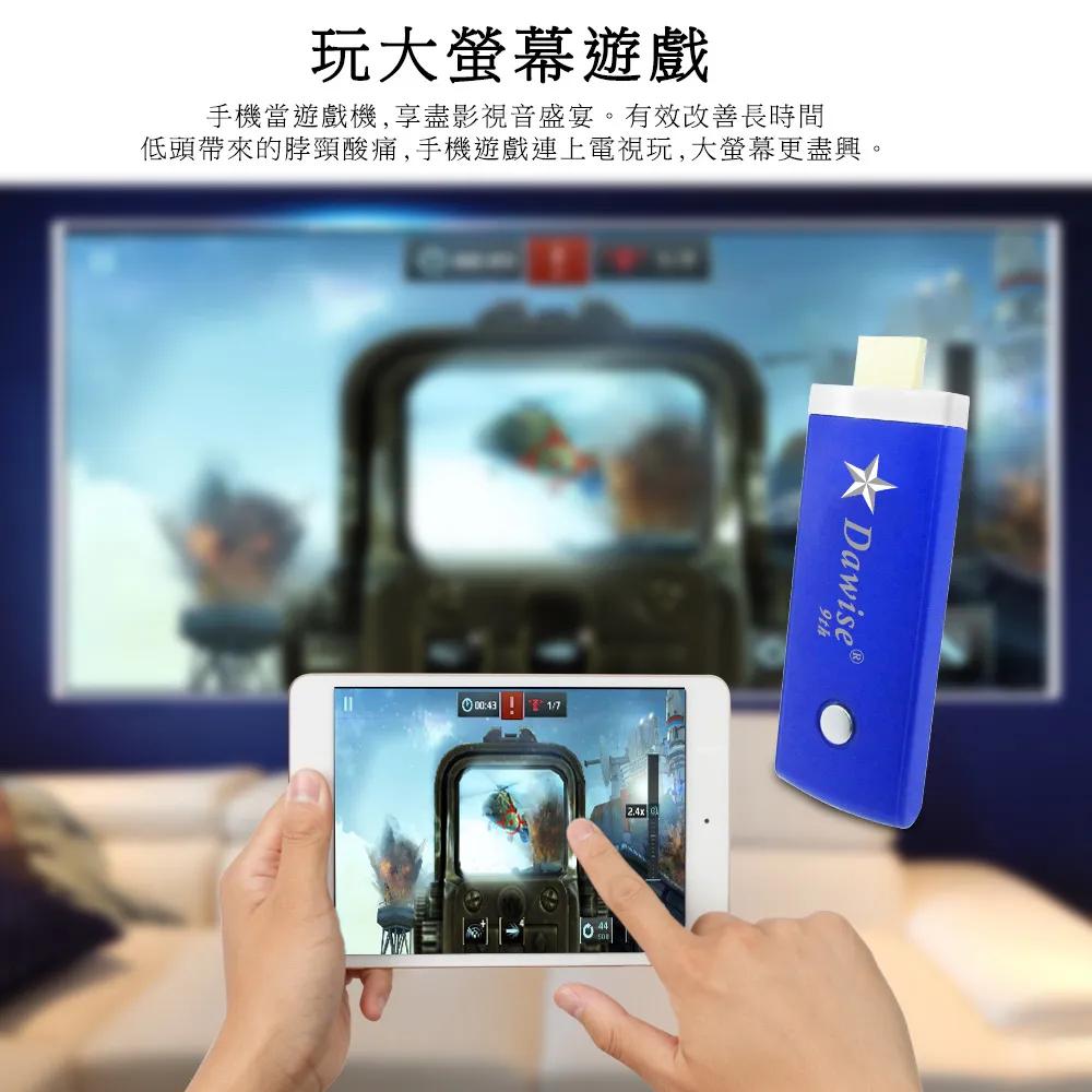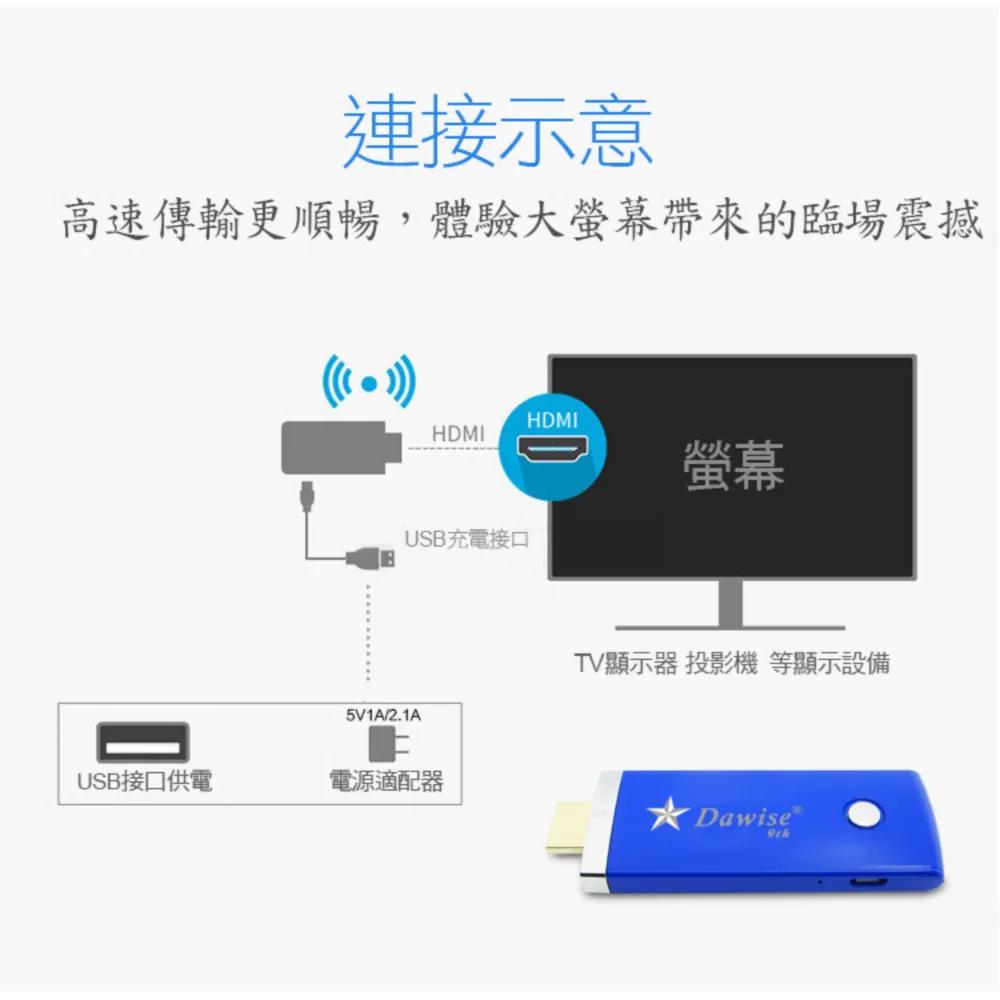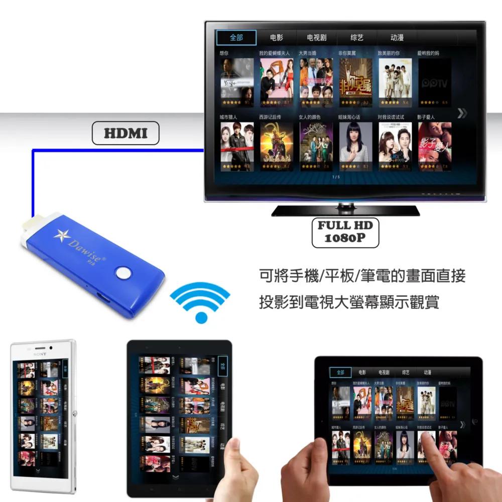 隨時隨地大螢幕娛樂操作簡單影音投影一機多用,教學娛樂導航全搞定免安裝任何軟體無線連結,影音同步分享支援蘋果/安卓/電腦無線投影可電腦直接電視同步顯示高畫質輸出,高速穩定傳輸《商品介紹》隨著智慧型裝置普及,手機、平板、電腦已成為日常不可或缺的工具。但螢幕太小往往影響學習與娛樂體驗。現在,只要一個 無線投影器,就能輕鬆將螢幕畫面同步到電視或投影機,大螢幕享受更清晰、更震撼!隨插即投:操作簡單,免驅動免APP。跨平台支援:支援 iOS / Android / Windows / Mac OS。高畫質輸出:支援 Full HD ,清晰不卡頓。穩定傳輸:低延遲設計,影音同步。輕巧便攜:出差、上課、居家,一機搞定。【應用場景】居家娛樂:追劇、看電影,大螢幕更沉浸。遊戲對戰:手機秒變遊戲主機,刺激加倍。教育教學:課堂同步投影,互動更生動。會議簡報:商務展示更專業,告別繁瑣連線。汽車導航:手機地圖投影到大螢幕,安全又直觀。《注意事項》1.如果要使用在汽車的螢幕投影,請先確認汽車是否有HDMI或AV影音輸入,請確認後再進行購買。2. 本商品是HDMI影音傳輸介面,如果是汽車是AV(黃白紅三色插孔)則需要另外自行準備HDMI轉AV的轉換器才可以使用。《商品配備》無線影音鏡像傳輸器 x1說明書 x14大好禮: USB充電器x1 + USB供電線x1 + HDMI延長線x1 + 手機支架或指環扣(二選一)《商品規格》廠牌: Dawise型號: 九代WD39顏色: 藍支援的設備: 蘋果,安卓,微軟裝置支援影音同步傳輸模式: AirPlay/Miracast/DLNA/WIDIUSB供電(DC+5V)HDMI連接電視產地: 中國大陸產品保固: 主機保固3個月,配件/贈品保固1個月,保固範圍不包含人為損壞。《NCC認證字號》CCAJ15LP0827T6