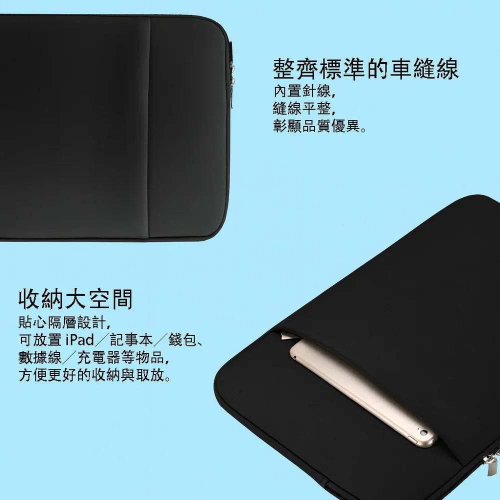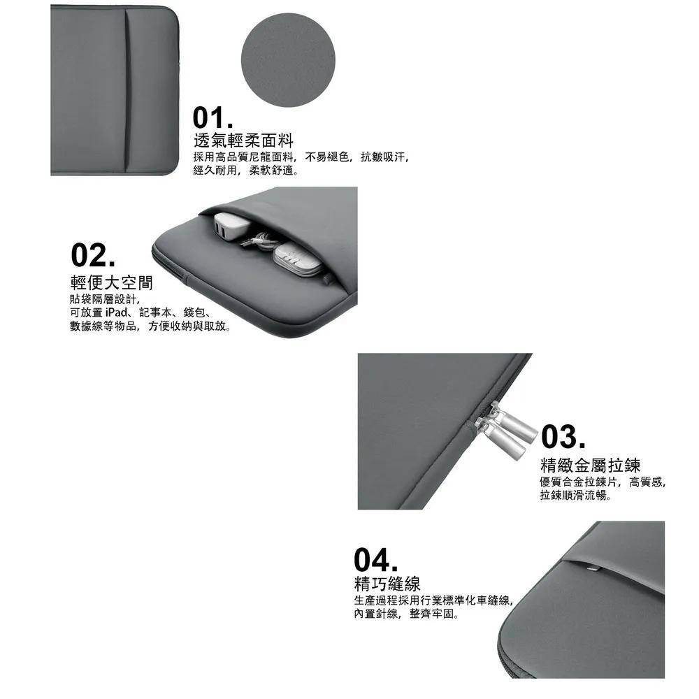 《商品介紹》輕輕呵護您的平板及筆電精緻輕薄,方便好攜帶■簡約精湛的設計■多重保護,防撞防污損■適用各種便攜式裝置設備■ 經久耐用,柔軟內襯,防震減壓1.可置放ipad/Mac/平板/筆電/手機,可當內襯包使用,加強保護。2.精緻美感,防護平板/筆電刮傷或碰撞。3.兼具防震緩衝、柔軟彈性等特點,手感細膩,舒軟,讓您的筆電/平板受到最好的保護。4.輕巧簡約便利攜帶5.防塵防撞,保護設備不受損《注意事項》請確認您的平板或筆電的長寬尺寸,再進行購買適當尺寸的保護包11吋 尺寸規格(長x寬): 30.3 x 21 (cm)13吋 尺寸規格(長x寬): 34 x 24.5 (cm)14吋 尺寸規格(長x寬): 37 x 25.5 (cm)15.6吋 尺寸規格(長x寬): 38.5 x 29 (cm)