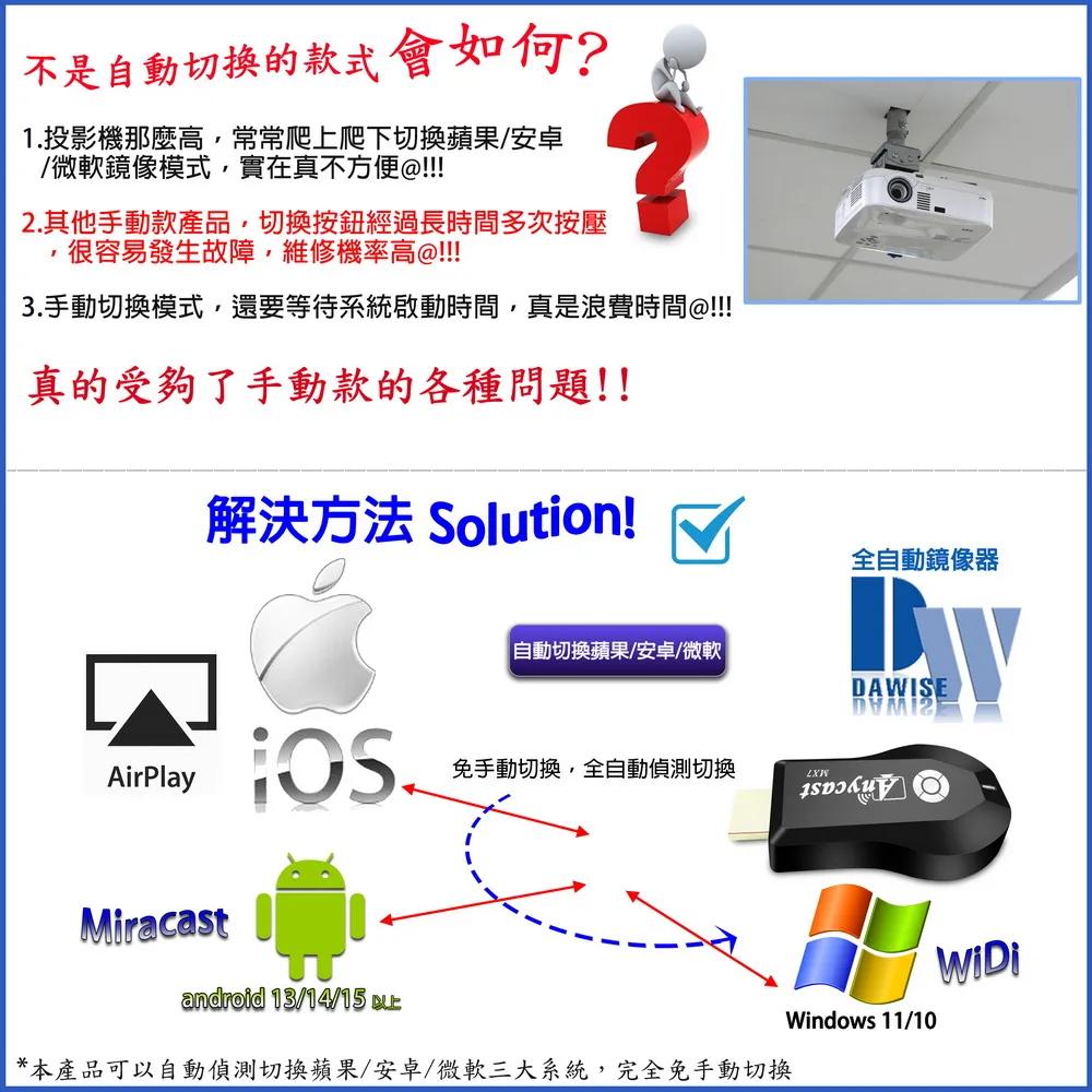 隨時隨地大螢幕娛樂操作簡單影音投影一機多用,教學娛樂導航全搞定免安裝任何軟體無線連結,影音同步分享支援蘋果/安卓/電腦無線投影可電腦直接電視同步顯示高畫質輸出,高速穩定傳輸《商品介紹》隨著智慧型裝置普及,手機、平板、電腦已成為日常不可或缺的工具。但螢幕太小往往影響學習與娛樂體驗。現在,只要一個 無線投影器,就能輕鬆將螢幕畫面同步到電視或投影機,大螢幕享受更清晰、更震撼!隨插即投:操作簡單,免驅動免APP。跨平台支援:支援 iOS / Android / Windows / Mac OS。高畫質輸出:支援 Full HD ,清晰不卡頓。穩定傳輸:低延遲設計,影音同步。輕巧便攜:出差、上課、居家,一機搞定。【應用場景】居家娛樂:追劇、看電影,大螢幕更沉浸。遊戲對戰:手機秒變遊戲主機,刺激加倍。教育教學:課堂同步投影,互動更生動。會議簡報:商務展示更專業,告別繁瑣連線。汽車導航:手機地圖投影到大螢幕,安全又直觀。《注意事項》1.如果要使用在汽車的螢幕投影,請先確認汽車是否有HDMI或AV影音輸入,請確認後再進行購買。2. 本商品是HDMI影音傳輸介面,如果是汽車是AV(黃白紅三色插孔)則需要另外自行準備HDMI轉AV的轉換器才可以使用。《商品配備》無線影音鏡像傳輸器 x1WiFi模組線x1說明書 x14大好禮: USB充電器x1 + HDMI傳輸線x1 + HDMI母對母轉接頭x1 + 手機支架或指環扣(二選一 隨機出貨)x1《商品規格》廠牌: Dawise型號: 七代PT32顏色: 銀支援的設備: 蘋果,安卓,微軟裝置支援影音同步傳輸模式: AirPlay/Miracast/DLNA/WIDIUSB供電(DC+5V)HDMI連接電視產地: 中國大陸產品保固: 主機保固3個月,配件/贈品保固1個月,保固範圍不包含人為損壞。《NCC認證字號》CCAJ15LP3122T9