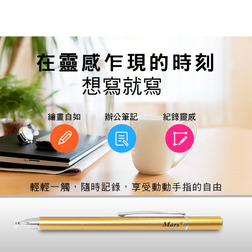 《商品介紹》攜帶方便,隨意書寫想畫就畫,想寫就寫免裝軟體,無需藍芽配對■書寫/塗鴉/繪圖最佳利器■適用所有電容式觸控螢幕■順滑好書寫■好握好寫,攜帶方便■筆夾設計,更方便隨身攜帶1. 本產品適用所有"蘋果/安卓/微軟"電容式觸控螢幕。2. 細字觸控筆,穩定/耐用/實用。3. 適用範圍更廣,可以使用在所有型號的iPad及iPhone, 更可以使用在電容式觸控螢幕的安卓平版及手機,微軟系統的電容式觸控螢幕也都適用。4. 不需搭配APP或是藍芽使用。5. 不需充電及電池就可以使用。