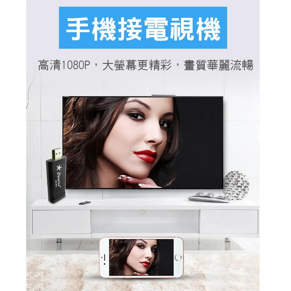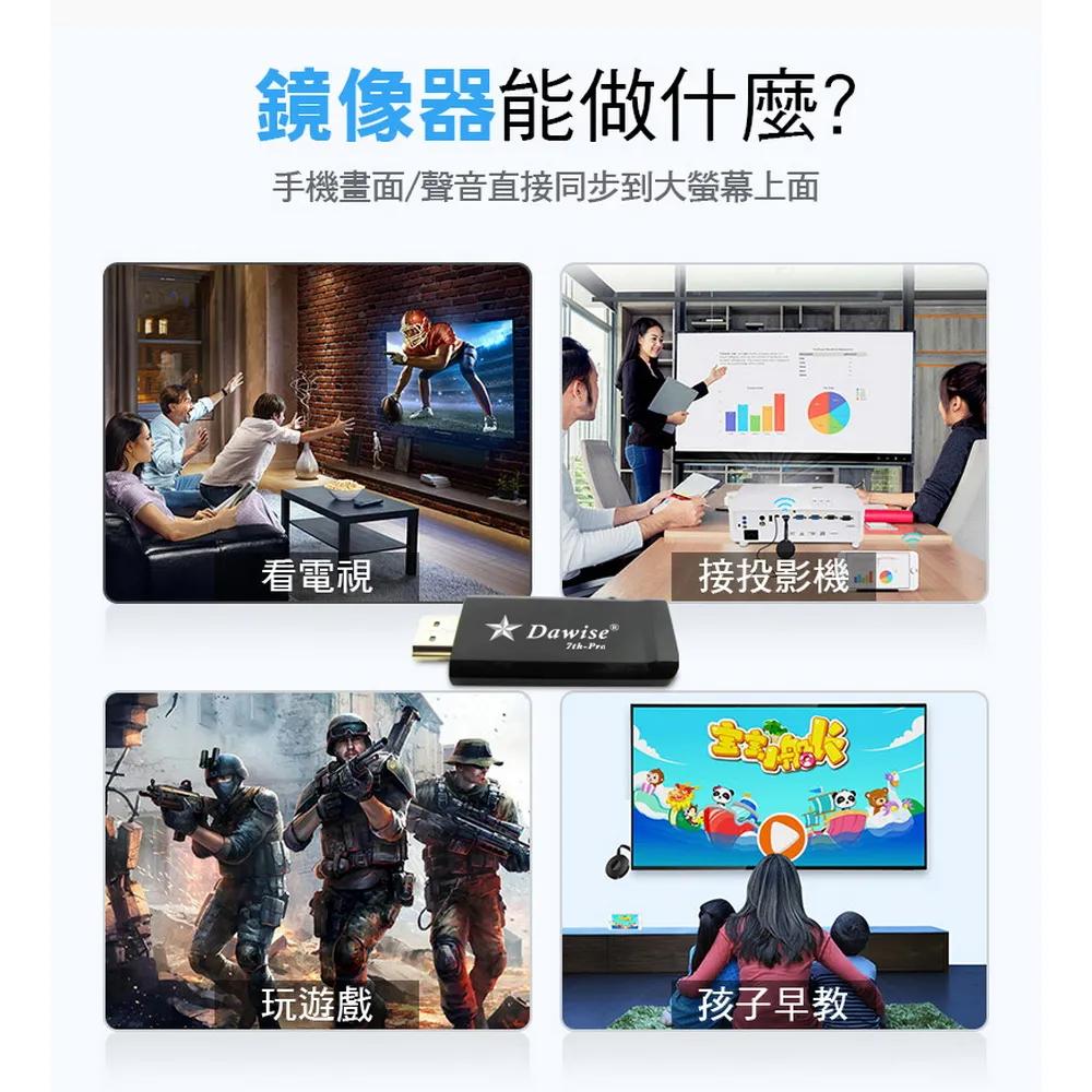 隨時隨地大螢幕娛樂操作簡單影音投影一機多用,教學娛樂導航全搞定免安裝任何軟體無線連結,影音同步分享支援蘋果/安卓/電腦無線投影可電腦直接電視同步顯示高畫質輸出,高速穩定傳輸《商品介紹》隨著智慧型裝置普及,手機、平板、電腦已成為日常不可或缺的工具。但螢幕太小往往影響學習與娛樂體驗。現在,只要一個 無線投影器,就能輕鬆將螢幕畫面同步到電視或投影機,大螢幕享受更清晰、更震撼!隨插即投:操作簡單,免驅動免APP。跨平台支援:支援 iOS / Android / Windows / Mac OS。高畫質輸出:支援 Full HD ,清晰不卡頓。穩定傳輸:低延遲設計,影音同步。輕巧便攜:出差、上課、居家,一機搞定。【應用場景】居家娛樂:追劇、看電影,大螢幕更沉浸。遊戲對戰:手機秒變遊戲主機,刺激加倍。教育教學:課堂同步投影,互動更生動。會議簡報:商務展示更專業,告別繁瑣連線。汽車導航:手機地圖投影到大螢幕,安全又直觀。《注意事項》1.如果要使用在汽車的螢幕投影,請先確認汽車是否有HDMI或AV影音輸入,請確認後再進行購買。2. 本商品是HDMI影音傳輸介面,如果是汽車是AV(黃白紅三色插孔)則需要另外自行準備HDMI轉AV的轉換器才可以使用。《商品配備》無線影音鏡像傳輸器 x1說明書 x14大好禮: USB充電器x1 + HDMI影音線x1 + HDMI母對母轉接頭x1 + 手機支架x1《商品規格》廠牌: Dawise型號: 七代E6顏色: 黑支援的設備: 蘋果,安卓,微軟裝置支援影音同步傳輸模式: AirPlay/Miracast/DLNA/WIDIUSB供電(DC+5V)HDMI連接電視產地: 中國大陸產品保固: 主機保固3個月,配件/贈品保固1個月,保固範圍不包含人為損壞。《NCC認證字號》CCAJ15LP0240T0
