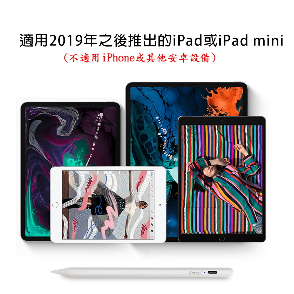 《商品介紹》攜帶方便,隨意書寫想畫就畫,想寫就寫免裝軟體,無需藍芽配對■書寫/塗鴉/繪圖最佳利器■順滑好書寫■好握好寫,攜帶方便■內建鋰電池充電設計■方便隨身攜帶1. 本產品只適用2019之後發表的蘋果iPad。。2. 內建鋰電池: 使用USB充電。3. 精密耐用纖維觸控筆頭,穩定/耐用/實用。4. 操作快速簡易,隨拿即用5. 不需搭配APP或是藍芽使用。6. 觸控位置精準,書寫非常流暢7. 本商品不是”蘋果Apple Pencil”,也與”蘋果Apple Pencil”功能不同,請確認後再購買。