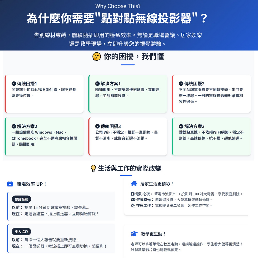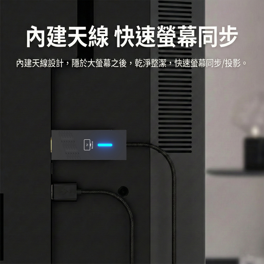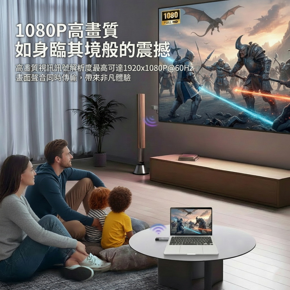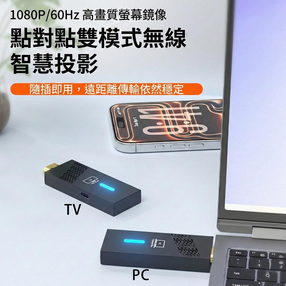 《商品介紹》隨時隨地 大螢幕娛樂隨插即用,快速上大螢幕• 點對點直連,開會不再手忙腳亂• 免安裝任何軟體• 影音同步輸出,看得順、聽得清• 快速分享畫面,溝通不用等• 低延遲體驗,互動更即時• 高畫質輸出,高速穩定傳輸支援最高 1920×1080@60Hz,影音同步輸出,會議簡報/教學展示/居家娛樂都能用。2.4G+5.8G 無線傳輸,空曠環境最遠可達 50 公尺高畫質輸出:支援 Full HD ,清晰不卡頓。穩定傳輸:低延遲設計,影音同步。輕巧便攜:出差、上課、居家,辦公,一機搞定。點對點傳輸:訊號直連輸出到 HDMI 顯示端(影像與音訊同步輸出)《使用方式》1.將「發射端(PC)」接到訊號來源的 HDMI;再接 USB 供電。2.將「接收端(TV)」接到電視/投影機 HDMI;再接 USB 供電。3.完成後即可顯示畫面(免繁瑣設定,依實際版本操作)。【應用場景】居家娛樂:追劇、看電影,大螢幕更沉浸。遊戲對戰:筆電秒變遊戲主機,刺激加倍。教育教學:課堂同步投影,互動更生動。會議簡報:商務展示更專業,告別繁瑣連線。《注意事項》1. 如果微軟筆電/蘋果Mac沒有HTMI介面,需另外自行購買或自備Type-C USB轉HTMI的轉換器 才可以使用本商品。2. 如果要使用在汽車的螢幕投影,請先確認汽車是否有HDMI或AV影音輸入,請確認後再進行購買。3. 本商品是HDMI影音傳輸介面,如果是汽車是AV(黃白紅三色插孔)則需要另外自行準備HDMI轉AV的轉換器才可以使用。