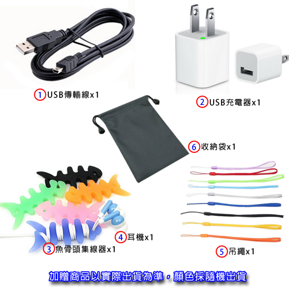 《商品配備》MP5主機6大好禮:充電器x1, USB傳輸線x1, 耳機 x1, 收納袋x1, 魚骨頭集線器x1,吊繩x1