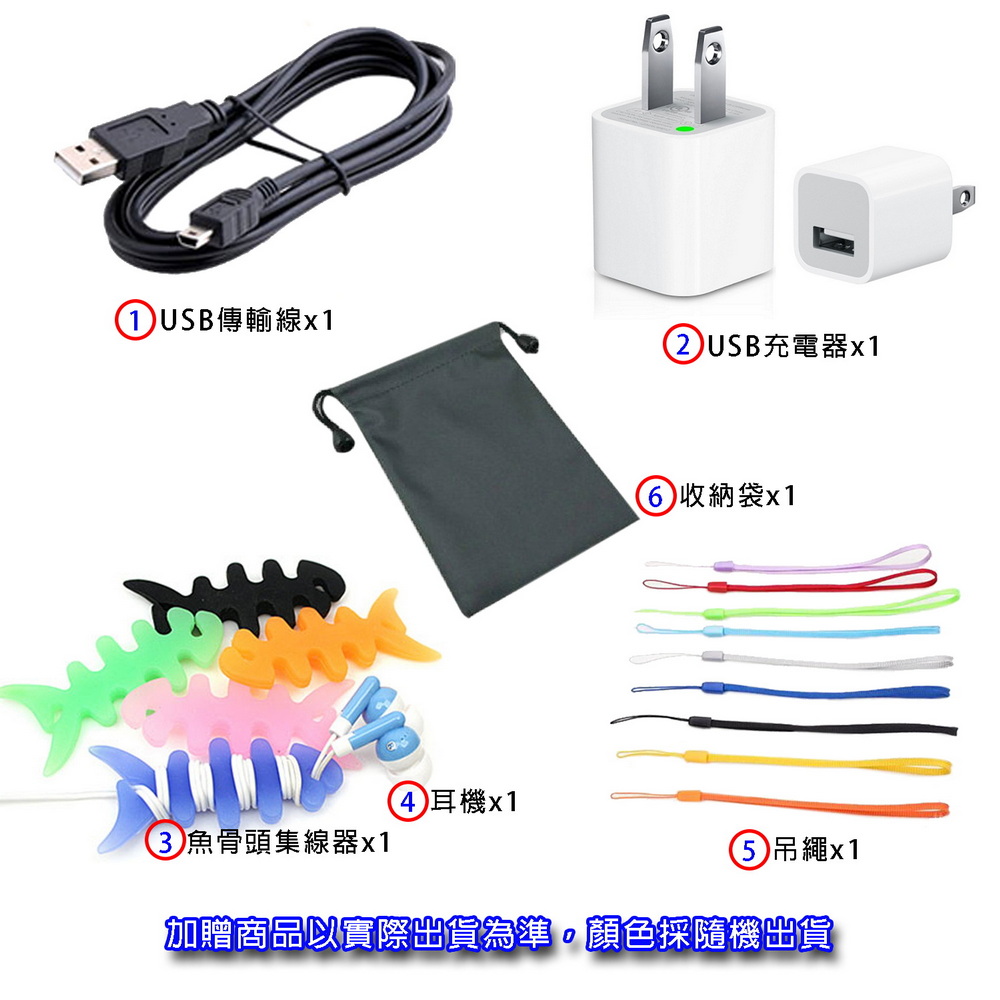 《商品配備》MP4主機 x132GB記憶卡x16大好禮: 充電器x1,USB傳輸線x1,耳機 x1,收納袋x1,魚骨頭集線器x1,吊繩x1