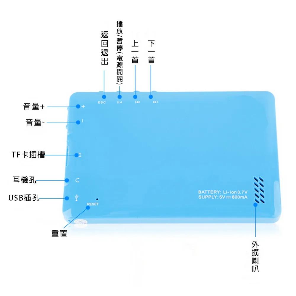 《商品介紹》專為影音娛樂而生不只是播放機, 更是你的口袋娛樂中心輕巧、時尚、功能全, 滿足你的影音需求高畫質螢幕, 看電影圖片相當清晰內建立體喇叭輸出支援多種高清解碼視訊具電子書閱讀功能內建多種遊戲, 滿足動感娛樂支援MP3、RM、RMVB、AVI、VCD、DVD、MOV、MKV等數十種影音格式播放高解析清楚的影片解碼, 讓您擁有掌上電影的視覺體驗高畫質顯示螢幕內建多款遊戲娛樂可讀TXT電子書支援錄音功能圖片格式: JPG、BMP格式可外插TF卡擴充容量語言: 繁體中文 / 簡體中文 / 英文....等音樂格式: MP3影片格式: MP4 、MKV、AVI 、RM、RMVB、3GP、FLV等格式錄音取樣頻率: 32K-64K內建鋰電池與電腦連結,隨插即用,不需驅動程式