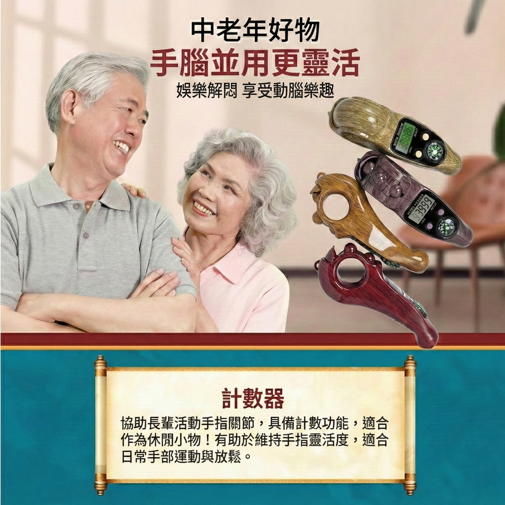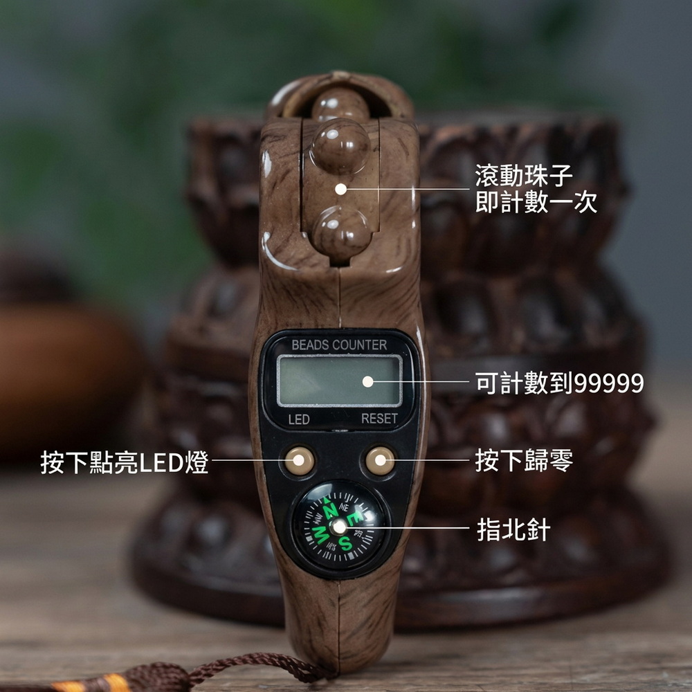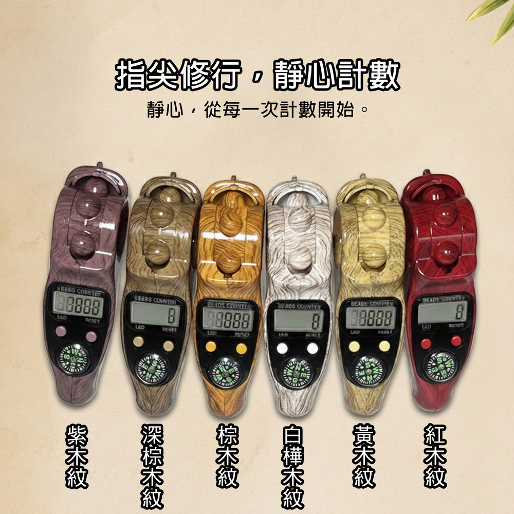《商品介紹》計數無憂,放鬆更專注指尖修行,靜心計數智慧伴侶滾珠計數,讓專注與放鬆同時到位指尖輕撥,心境自闊每一轉,都是靜心的開始修行冥想,專注訓練輕量隨行,持久續航在繁雜的生活中,找回規律與寧靜傳統念珠的厚重感,在現代生活中有了更輕盈的選擇。這款計數器模擬撥動佛珠的手感,讓你隨時隨地都能進入專注靜心的狀態。無論是冥想打坐、誦經計數,或是日常壓力下的指尖放鬆,它都能幫你記下每一分寧靜。指尖上的修行:操作簡單,靜心計數,讓專注與放鬆同時到位。一器在手,計數無憂,放鬆更專注內置滾珠保護設計,耐摔耐用,隨身攜帶也安心多色木紋外殼,時尚耐看,適合居家、辦公、瑜伽、冥想與工作休憩禪修、祈禱、靜心等安定心緒的實用小物手感舒適、握持穩定:長時間操作也不易疲憊【應用場景】修行冥想:數位顯示清晰,精準記錄念經、持咒次數,讓修行無礙。戶外探險: 內建指南針,助您在登山健行時辨別方向;計數功能亦可記錄步數或呼吸頻率。長輩使用:轉動滾珠作為日常手部活動的小物,操作簡單、握持舒適。專注訓練: 陪伴孩童練習專注,遠離3C產品,從指尖練習靜心。辦公解壓:工作間隙揉動滾珠減壓,安靜不擾人,計數任務提升專注,會議或加班皆宜。學習閱讀:讀書計頁數、寫作記單字,舒適握持掛繩便攜,輔助學生考試或研究進度。