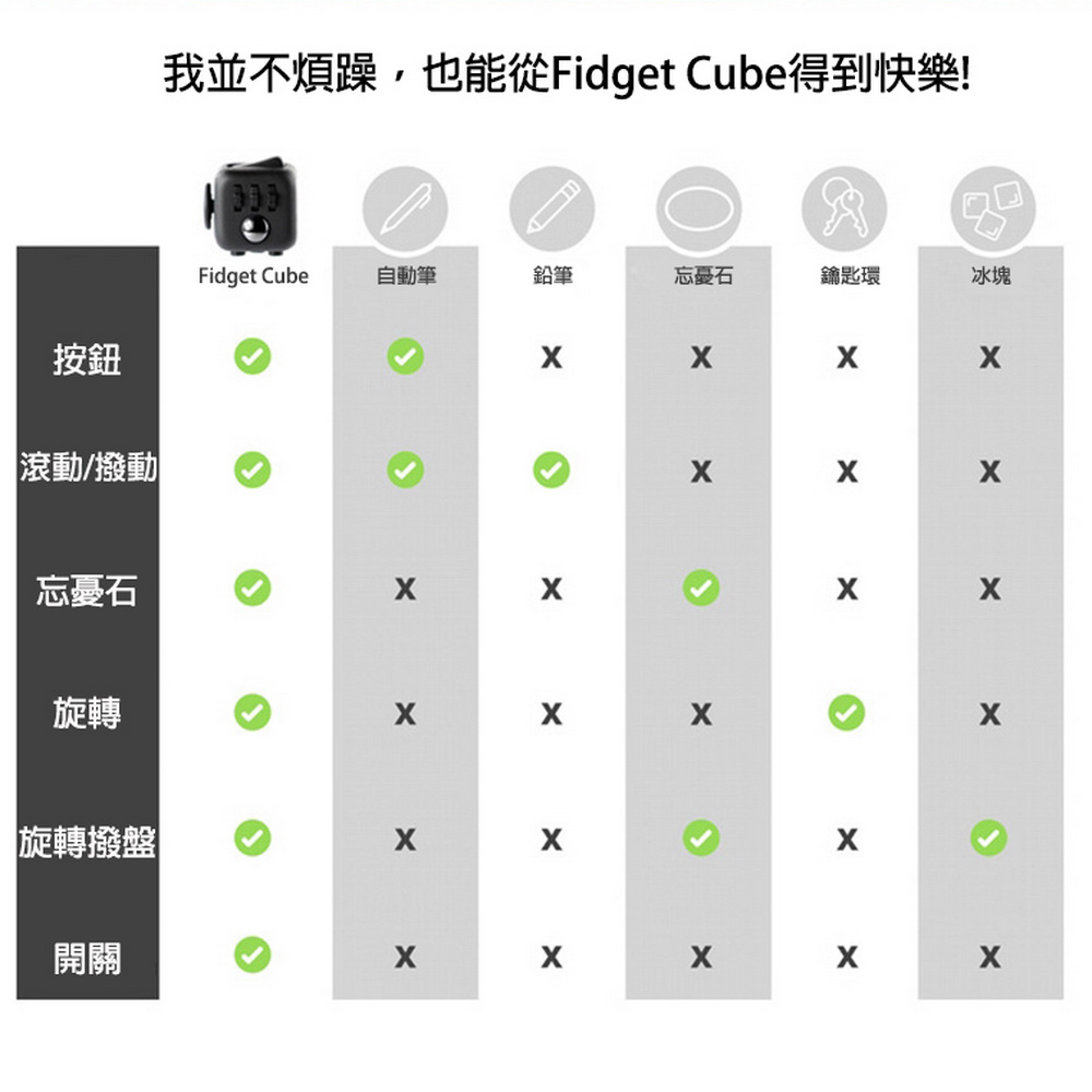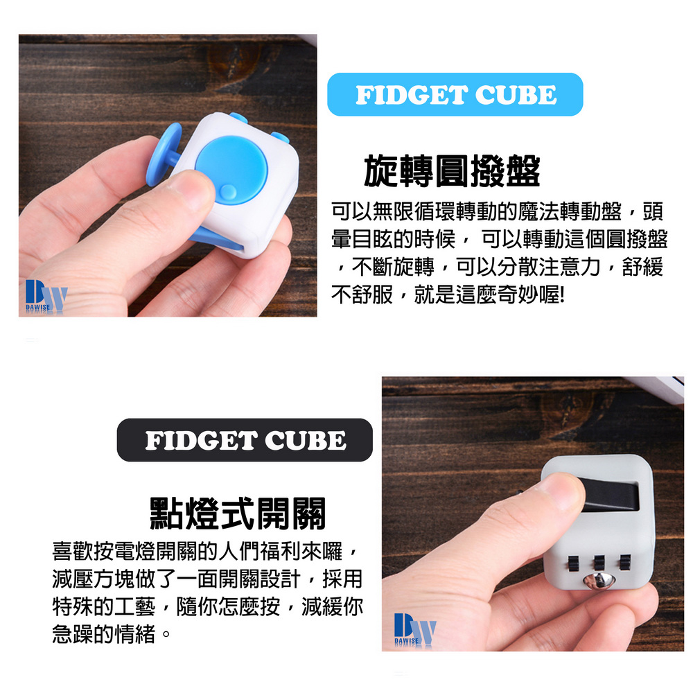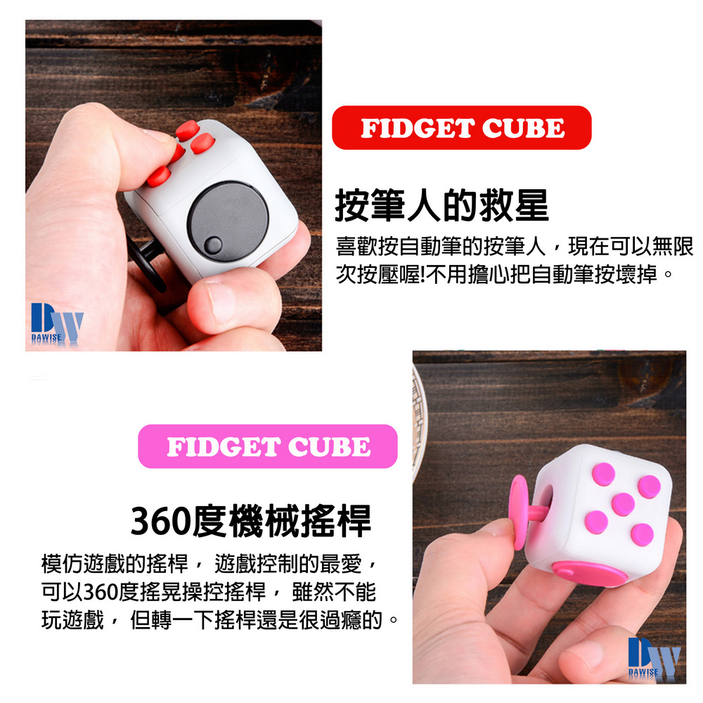 《商品介紹》情緒紓解的最佳創意神器獨特解壓功能設計按、壓、滾、滑、搖,撥,轉的獨特解壓抗焦躁減壓神器攜帶方便、迷你小巧、使用便利獨特解壓功能只為帶走你生活中的煩躁我們所有人都會面臨各種各樣需要調解情緒的狀況、壓力、挫折、緊張、注意力分散等等...現在你只要用手按壓解壓方塊(Fidget Cube),給自己一個有效的情緒舒緩,快速的調解情緒,這就是我們推出解壓方塊的目的所在。解壓方塊(Fidget Cube)的使用非常簡單,有六個面就像魔術方塊一樣,每個面都持有獨特的調解情緒的功能,能調節你的負面情緒。按、壓、滾、滑、搖,撥,轉的獨特解壓舒緩你焦躁不安的情緒滿足你無法停止的小動作抗焦躁減壓神器攜帶方便、迷你小巧、使用便利獨特解壓功能只為帶走你生活中的煩躁試試解壓方塊,煩躁情緒立刻消除