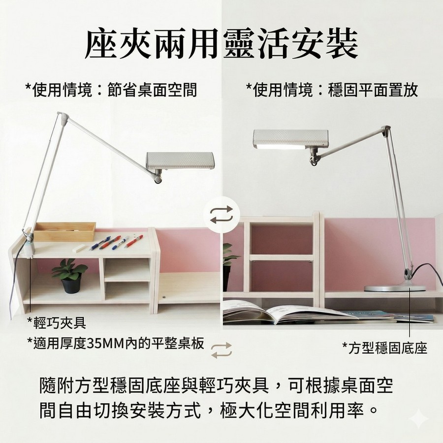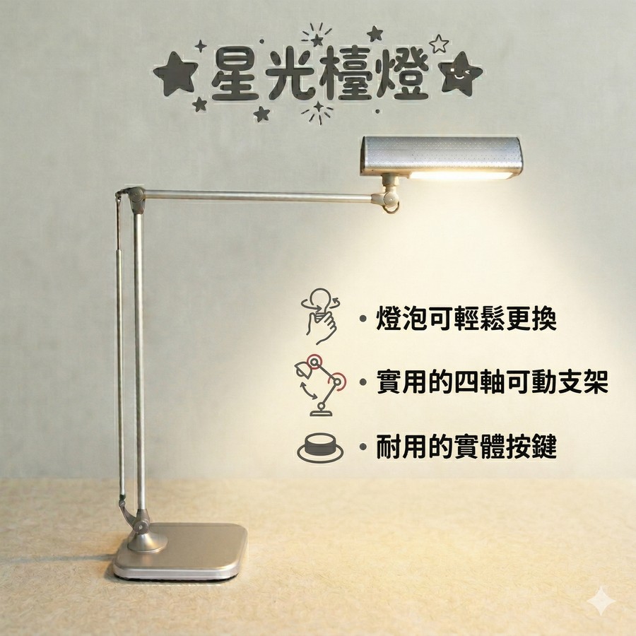 向上投射星光點點,美翻天向下投射均勻照明,舒適護眼上下發光效率極大化並平衡照度差經典雙臂支架,好拉好折好實用蜂巢柔光格柵,避免誤觸燈泡,好貼心使用E27 LED 燈管,自己更換好輕鬆