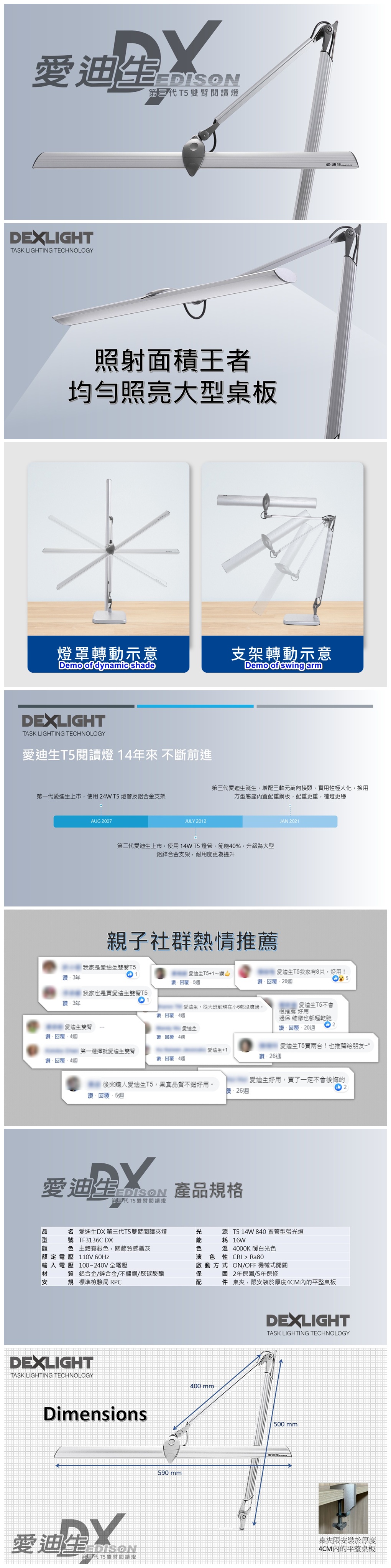 台灣製造愛迪生DX 第三代T5雙臂閱讀夾燈